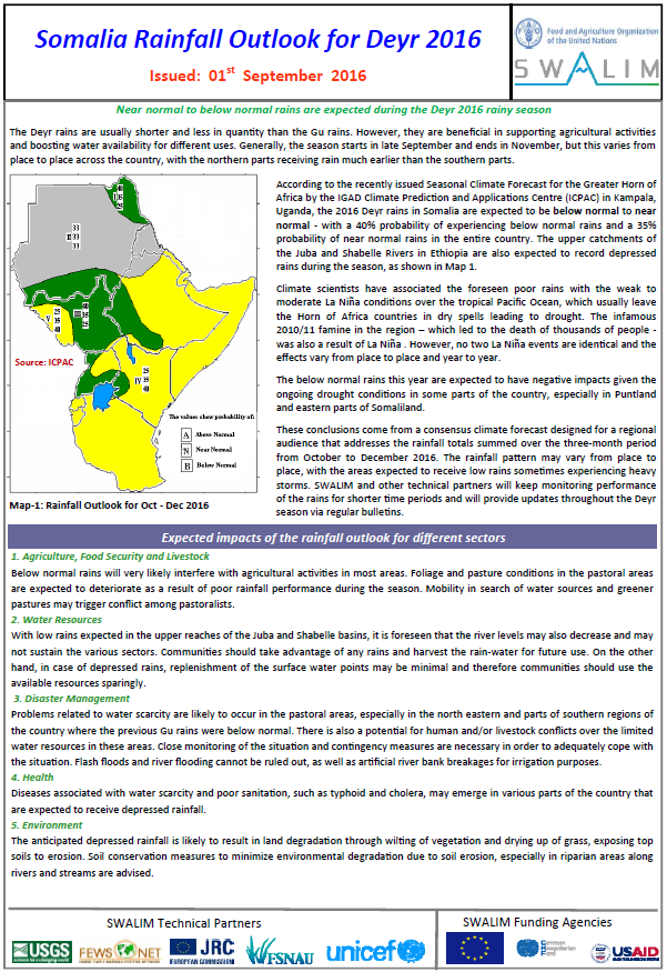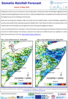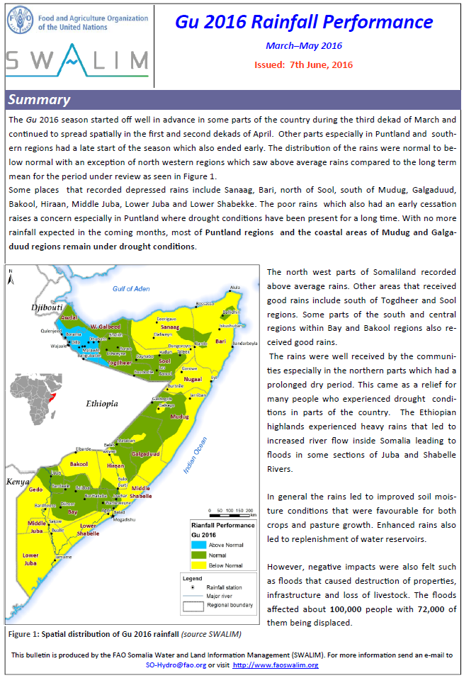 Since 2006 Somalia Water and Land Information Management (SWALIM) has been operating in Puntland. Informative data has been collected on land, water and climate. The information is organized in themes: Water resources (Climate, floods, water resources and water reports); Land resources (Land degradation, Land suitability, soils and land reports). This information is generated with the support of a strong Information management, GIS and remote sensing units in collaboration with Puntland government partner institutions. SWALIM information management team has organized the data to facilitate quick retrieval through a variety of online and offline platforms. Download publication (pdf, 3.5 MB)