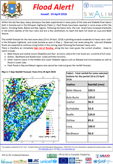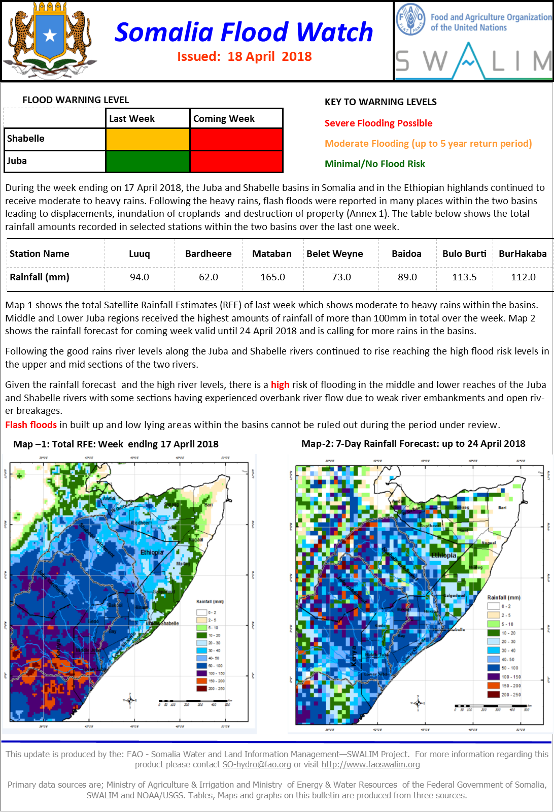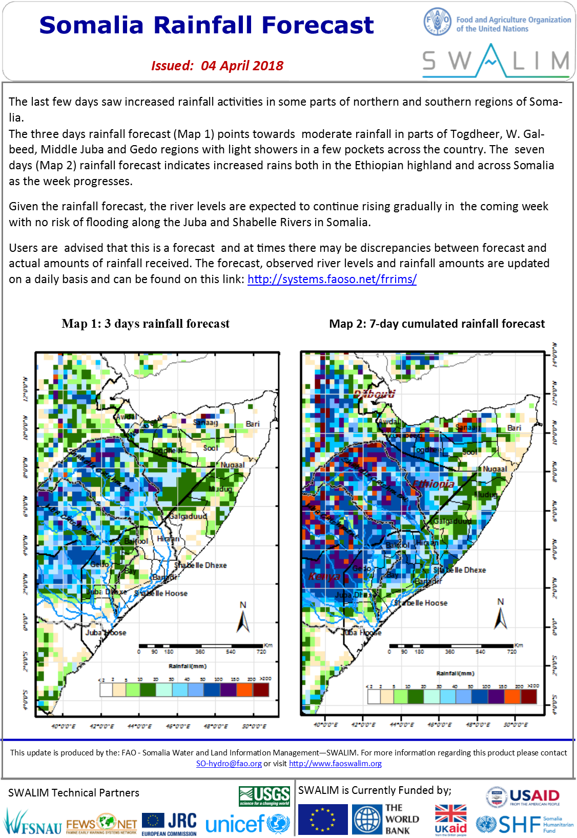Based on NOAA-NCEP GFS, dry conditions are expected to prevail in most parts of the country with chances of very light rains in some parts of Jubaland (Figure 1). Dry conditions are also expected over the entire Shabelle River catchment.Publication Download
