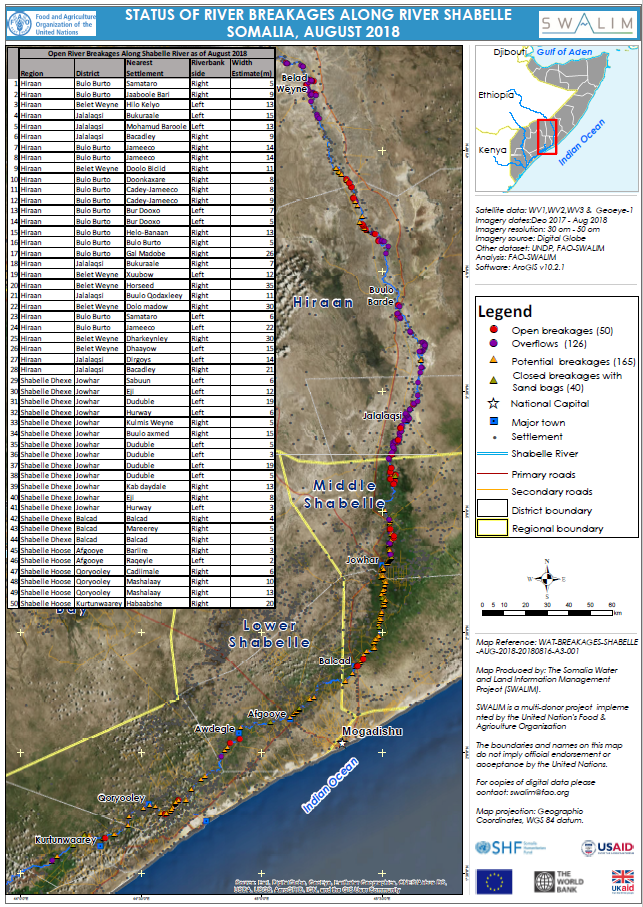 With the Deyr rains expected in October and November 2018, river levels will increase with a likelihood of flooding especially where open and overflow points have been identified. There is therefore an immediate need to close the open points and reinforce areas where there are weak river embankments. Maps of the status of river breakages, with detailed information, have been produced at large scale and hardcopies can be obtained from SWALIM offices.