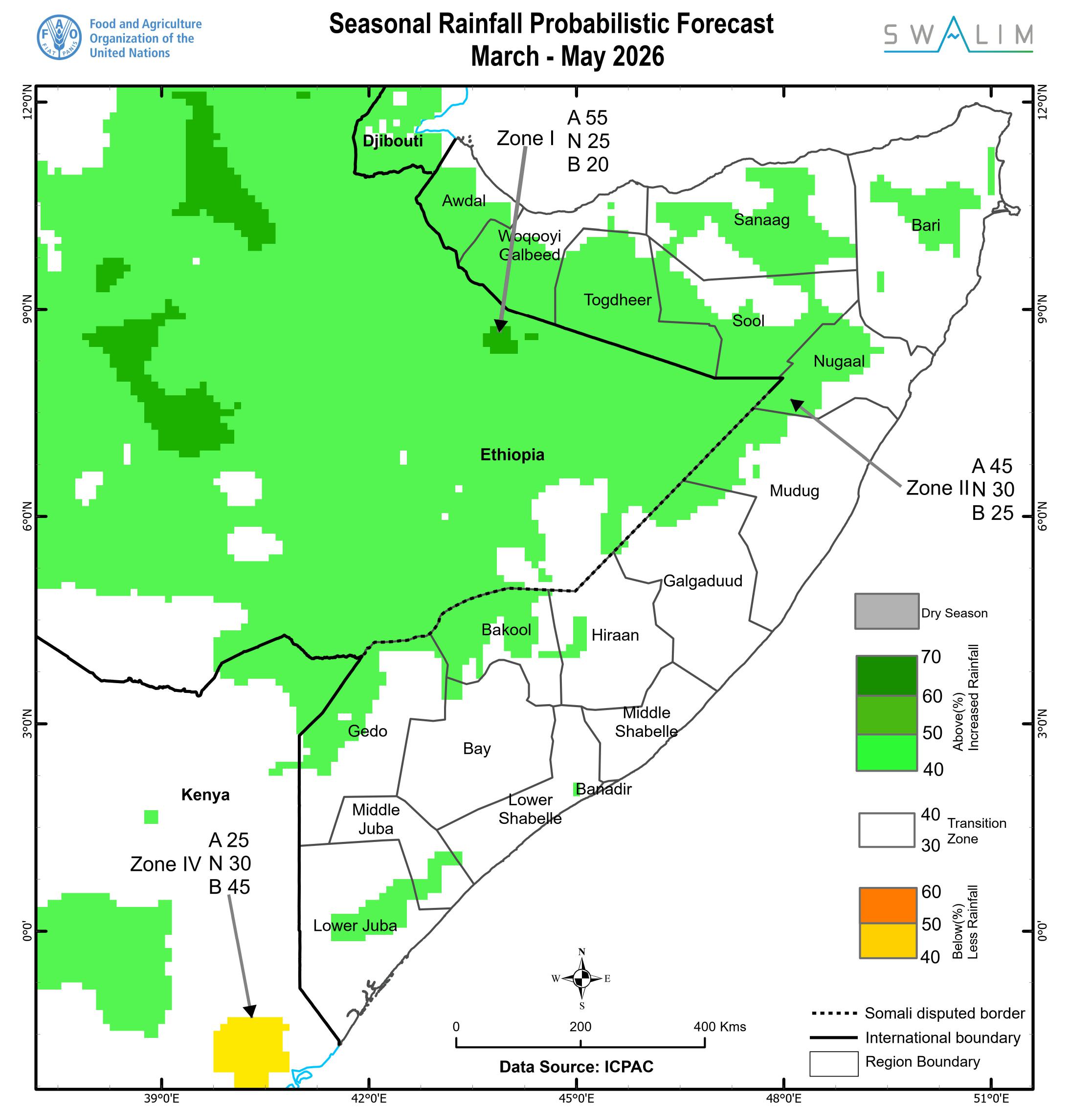Rains are most likely to begin over Gedo in the third week of April, progressing eastwards to Lower and Middle Juba, Bay, Bakool, Lower and Middle Shabelle, Hiraan, Galgaduud, Awdal, Woqooyi Galbeed, and Sool by the fourth week of April (Figure 3).Publication Download