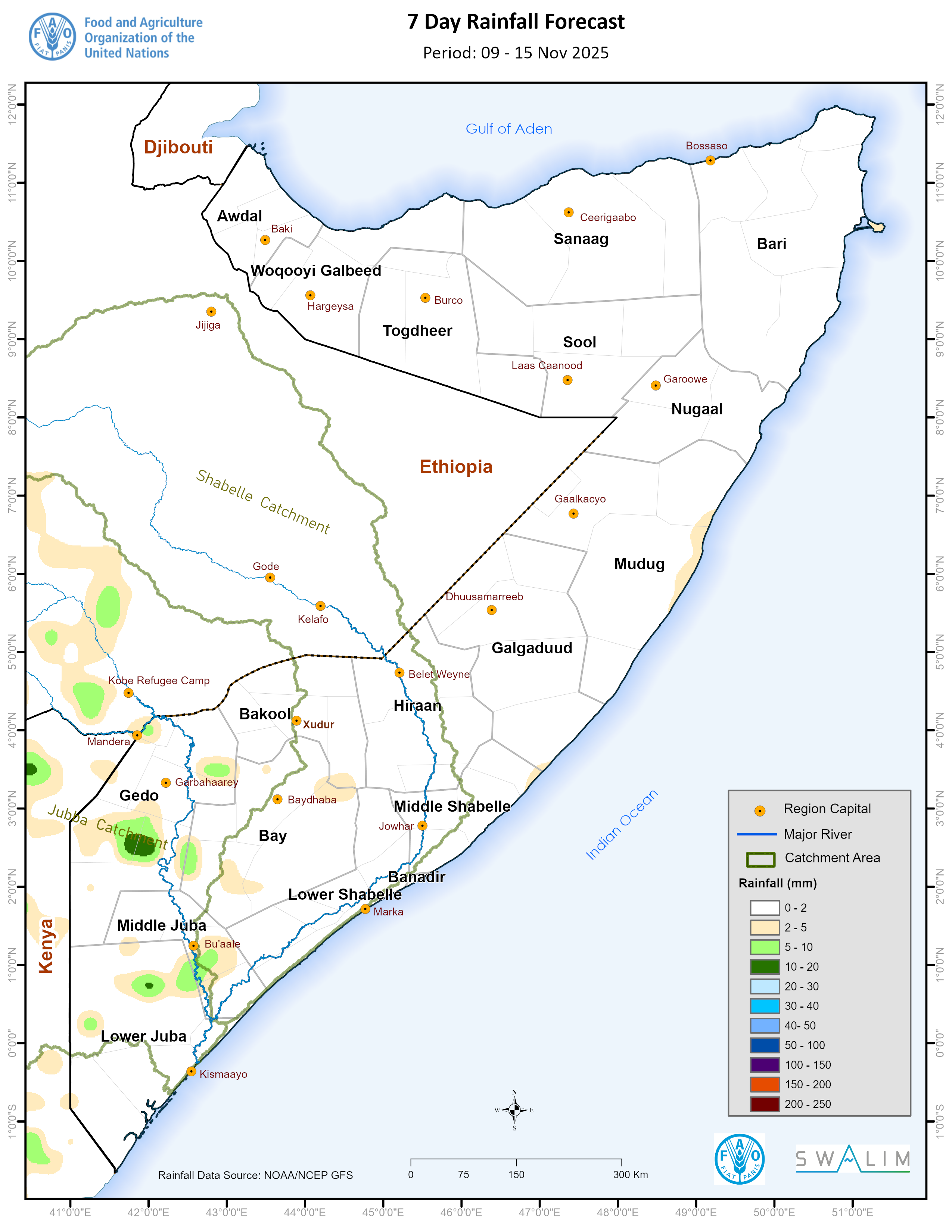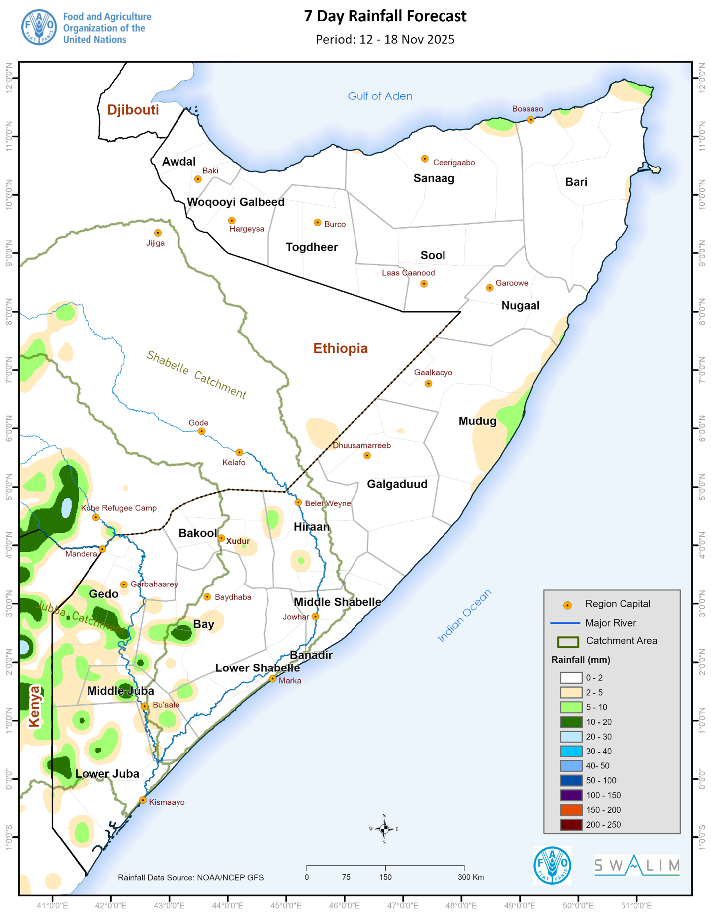 According to NOAA-NCEP GFS, light rains are likely over some areas in the south with dry conditions expected to prevail in most other parts of the country, particularly Somaliland and Puntland (Figure 2). The rains in the south may be of moderate intensity over isolated areas in Bay, Lower Shabelle, Banadir, and Middle Shabelle regions, and over the coastal parts of both Galgaduud and Mudug. These light to moderate rain is likely to be observed between 22 and 24 November 2025.