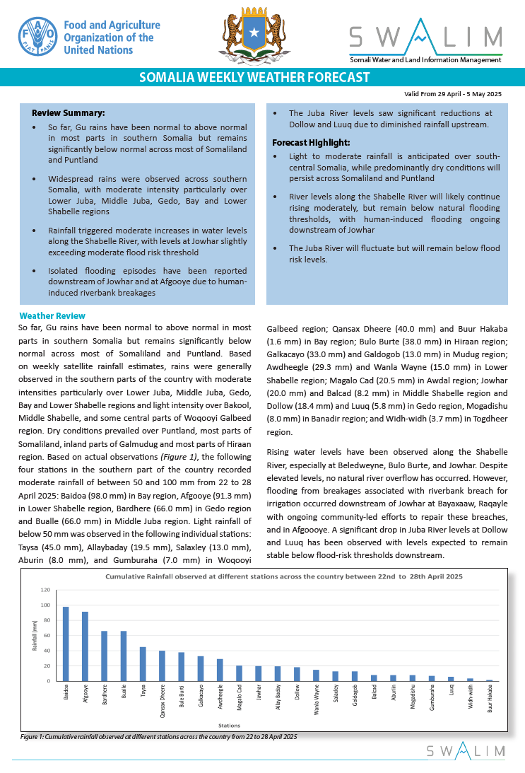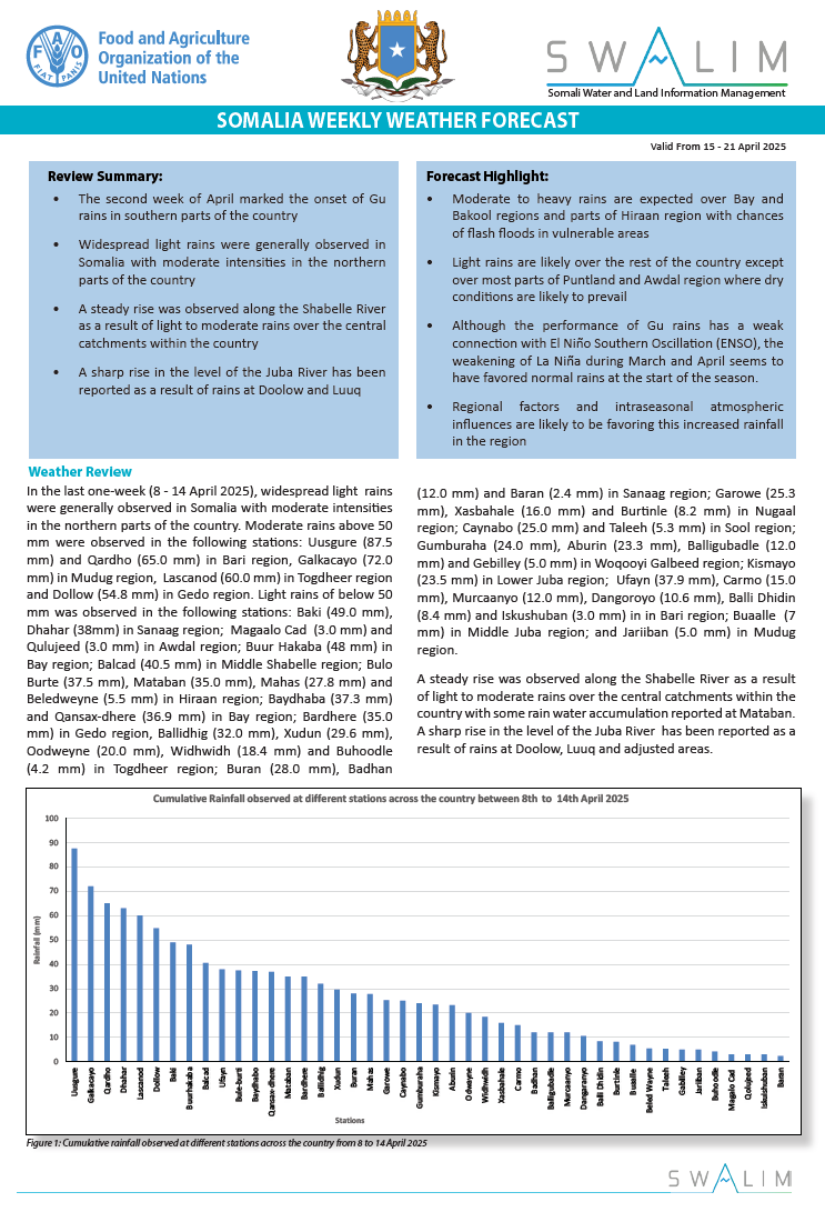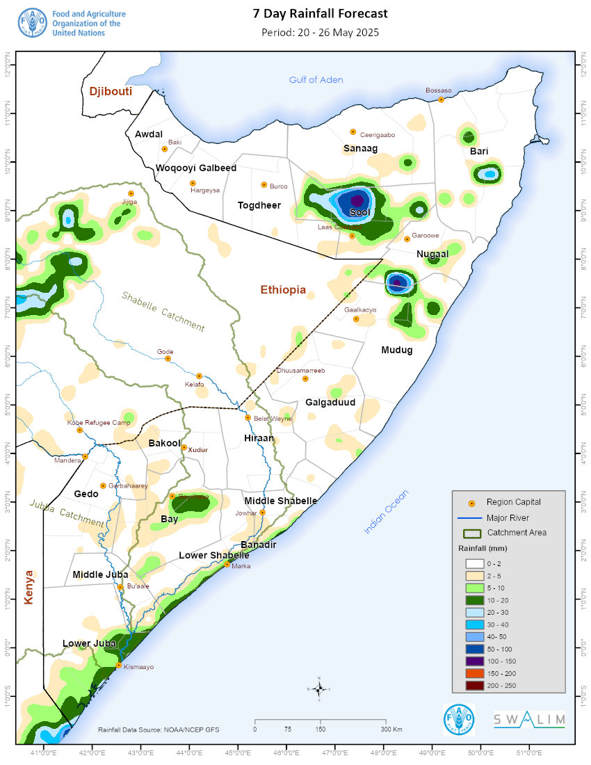 Moderate rainfall of between 50 and 100 mm is forecast over Jalalaqsi district in Hiraan region; northern parts of both Jowhar and Cadale districts in Middle Shabelle region; northern parts of Wanla Weyn district in Lower Shabelle region; Galdogob and western parts of Galkacyo district in Mudug region; and northeastern border areas of Xudur district with Ceel Barde district in Bakool region. The middle sections of the Shabelle River catchment within Somalia and its upper catchments in Ethiopia is also likely to observe rains of moderate amounts.