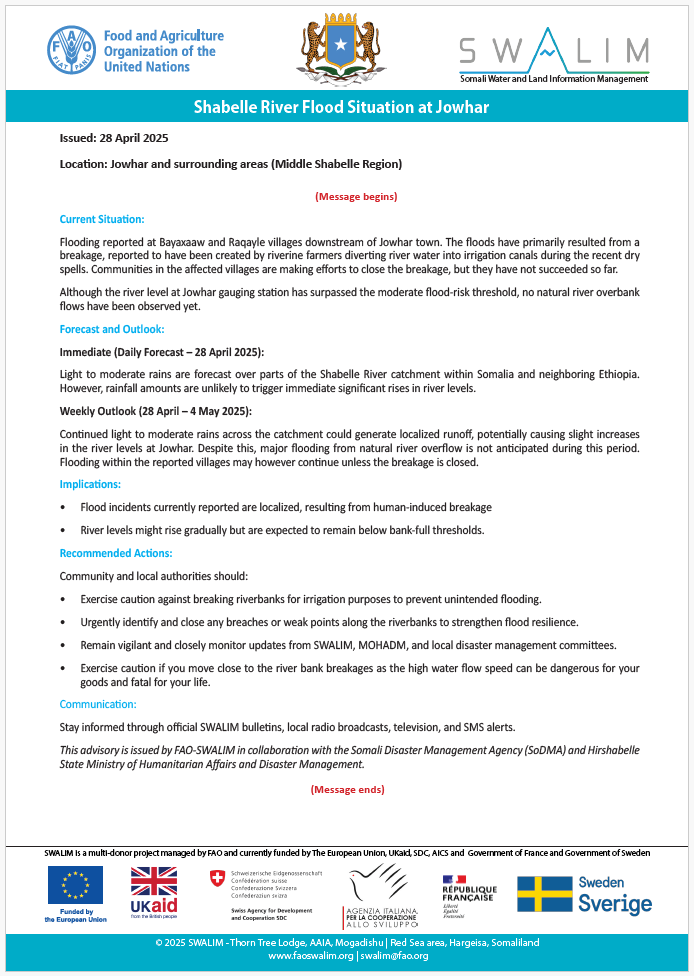 Based on the available observed and forecast data, the likelihood of flooding along both Juba and Shabelle Rivers remain low.