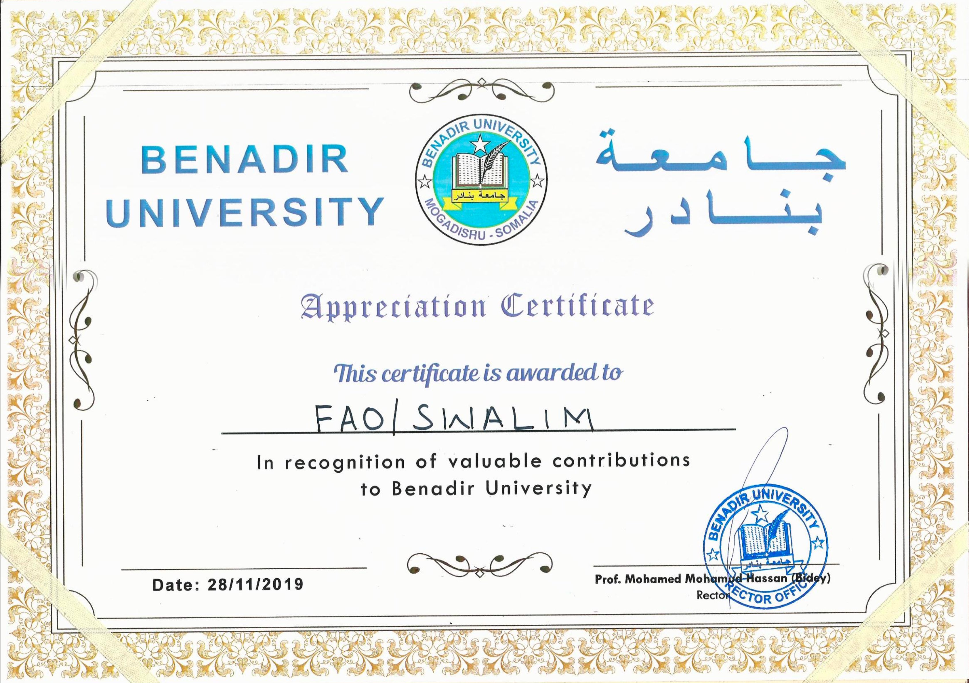 This month SWALIM was honored by Banadir university for the collaboration with the institution in Disaster Risk Reduction, Soil sampling and analysis and providing data abd information on Somali land and water resources for student research.