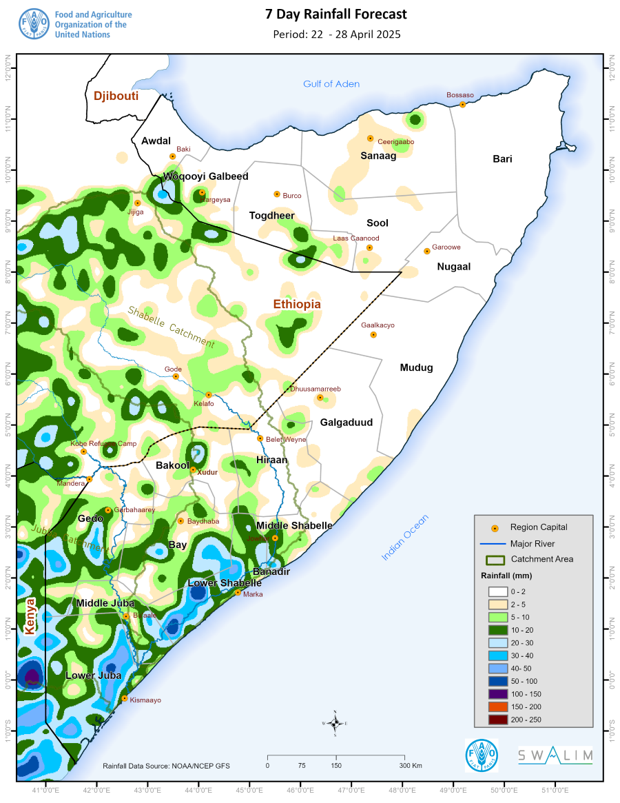 According to NOAA-NCEP GFS, widespread light to moderate rainfall is expected over most parts of central Somalia including Nugaal, Mudug, Galgaduud, Hiraan, Middel Shabelle, Bay and Bakool regions. The north and southmost parts of the country are expected to remain dry. The spatial spread of the forecast rainfall conditions are as follows (Figure 1): Moderate rainfall of between 50.0 and 100.0 mm is forecast over most parts of Galkacyo district in Mudug, central parts of Burtinle district in Nugaal, central parts of Tayeeglow district in Bakool and central parts of Bulo Burte district in Hiraan region which forms the middle section of the Shabelle River in Somalia. Rains of similar moderate intensity are also likely over the uppermost catchment of Shabelle River in Ethiopia. Light rainfall of less than 50.0 mm is expected over most other parts of Mudug, Nugaal, Bakool and Hiraan regions. Rains of lighter intensity are also likely over most parts of Galgaduud, Middle Shabelle, and Bay regions, Luuq district in Gedo region, Bu’aale district in Middel Juba region, southern parts of Qardo and Bandarveyla districts in Bari region. Similar light rains are expected over the middle and upper sections of the Juba River catchment and over upper portions of Shabelle River catchment within Somalia. Dry conditions are likely over most parts of Somaliland including Awdal, Woqooyi Galbeed, Togdheer, Sool and Sanaag regions; most parts of Bari, Lower Juba, Middle Juba, and Lower Shabelle regions. Dry conditions are also likely to prevail over most parts of Garowe district in Nugaal region; Cadaado and Cabudwaaq districts and eastern parts of Ceel Buur district in Galgaduud; Jilib abd Saakow districts in Middle Juba region; Baardheere, Ceel Waaq, Garbahaarey, Belet Xaawo and Dollow districts in Gedo region;and coastal parts of Middle Shabelle including Banadir. Similar dry conditions are likely over most areas over the lower sections of the Juba River catchment within Somalia.