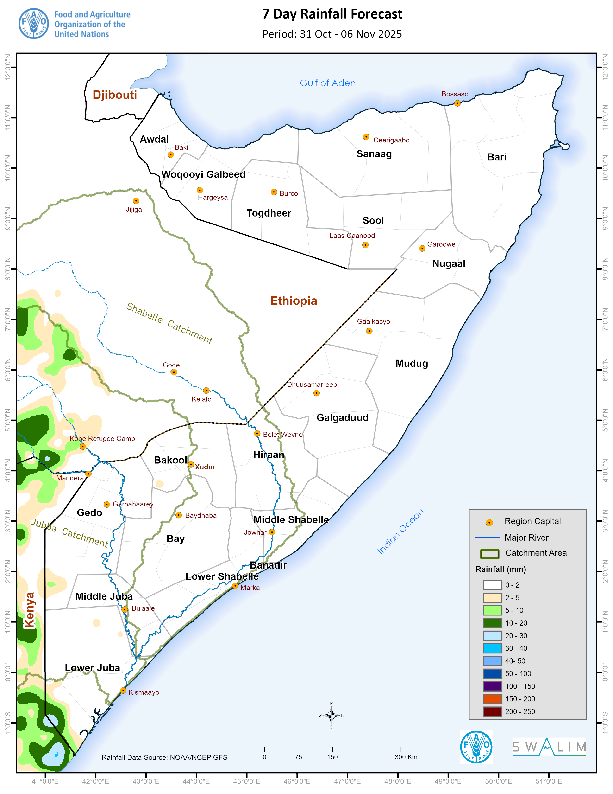 Light rainfall of less than 50 mm is expected over most parts of Belet Weyne district in Hiraan region; Galkacyo, Hobyo and Xaradheere districts in Mudug region; Ceel Buur district in Galgaduud region; Adan Yabaal district in Middel Shabelle region; Wanla Weyn district in Lower Shabelle region; northern parts of Xudur district, eastern parts of Ceel Barde district and northern parts of Tayeeglow district in Bakool region; Ceel Waaq district and northern parts of Baardheere district in Gedo region and some localized parts of Bay region. Rainfall of lighter intensity is likely to be observed in areas adjacent to the above districts and regions including the middle sections of the Juba River catchment within Somalia and upper catchments outside the country. Most parts of the Shabelle River catchment in the Somalia-Ethiopia border are likely to receive similarly light rains.