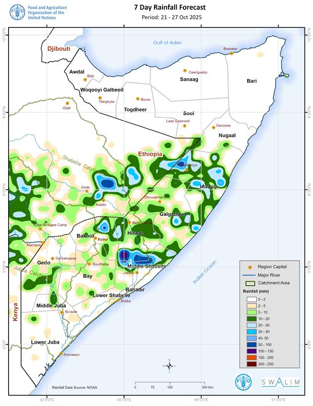 Moderate rainfall of between 50 and 100 mm is forecast over Jalalaqsi district in Hiraan region; northern parts of both Jowhar and Cadale districts in Middle Shabelle region; northern parts of Wanla Weyn district in Lower Shabelle region; Galdogob and western parts of Galkacyo district in Mudug region; and northeastern border areas of Xudur district with Ceel Barde district in Bakool region. The middle sections of the Shabelle River catchment within Somalia and its upper catchments in Ethiopia is also likely to observe rains of moderate amounts.