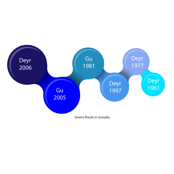 Somalia experiences two types of flooding: river floods and flash floods. River floods occur along the Juba and Shabelle rivers in Southern Somalia, whereas flash floods are common along the intermittent streams in the northern part of the country. In the recent past, the country has experienced an increasing severity and frequency of floods. The historically most recent severe floods were those of the Deyr in 1961, 1977, 1997, and 2006, and the floods of the Gu in 1981 and 2005. These floods resulted in human casualties and major economic damage.