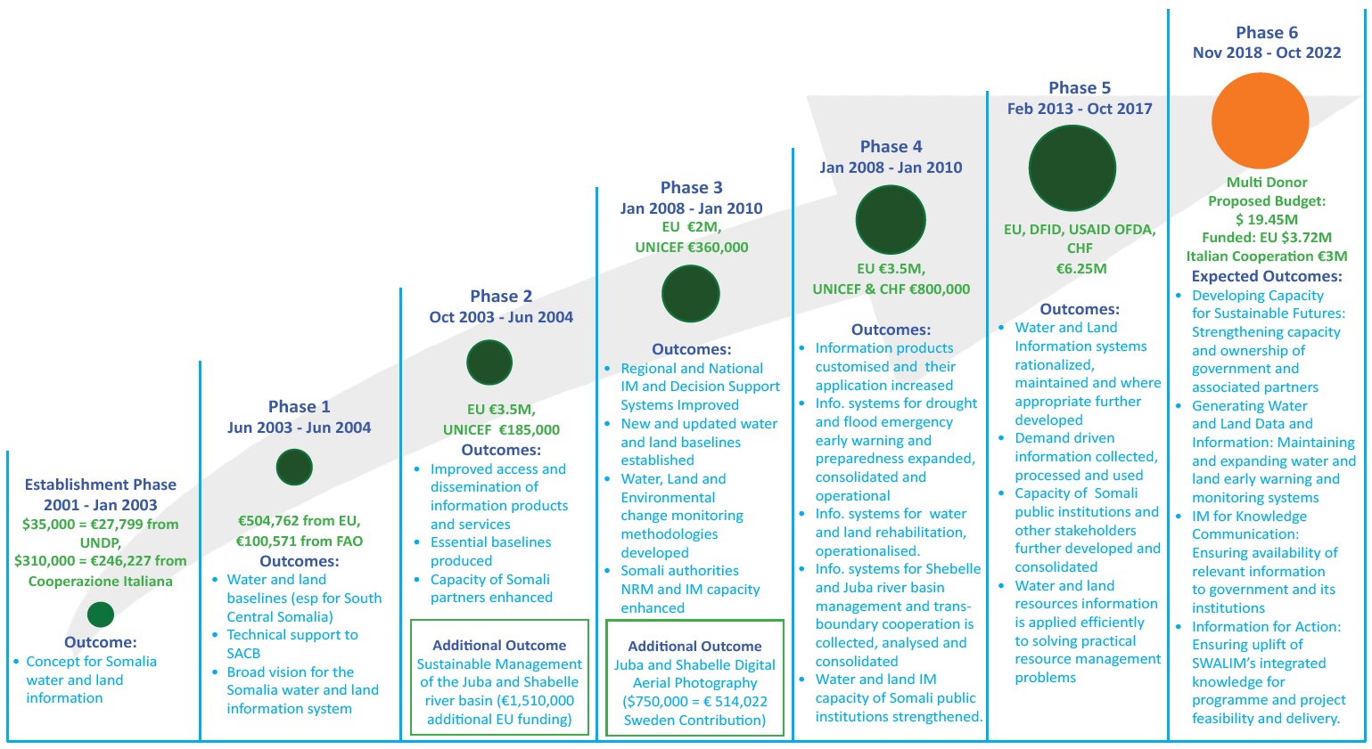 SWALIM's activities are managed through project phases usually running for between 1 and 4 years per phase. During each phase, specific tasks are identified and mapped out in a logical framework through which overall impact and outcome and specific outputs are identified. Each output is then broken down into specific activities geared to ensuring the output is acheived. The activities have targets assigned to them that are measurable and time-bound. Each new phase builds upon the acheivements of the previous phase to ensure that the information produced is useful in supporting sustainable natural resource management and addressing the challenges that exist at a particular time.
