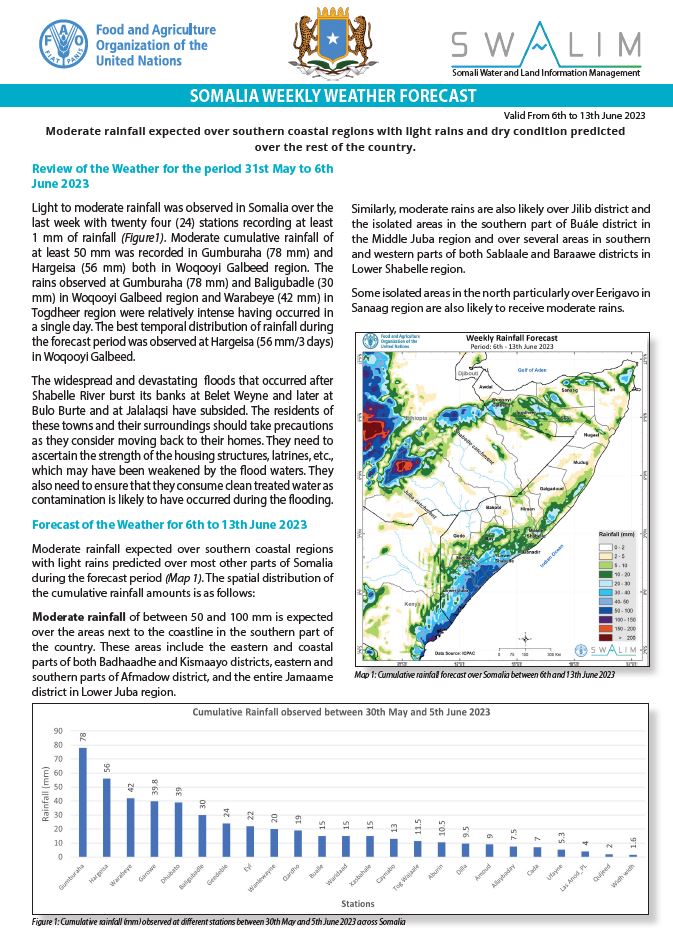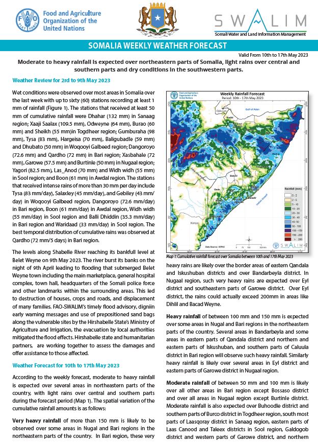 Moderate rainfall of between 50 and 100 mm is forecast over Jalalaqsi district in Hiraan region; northern parts of both Jowhar and Cadale districts in Middle Shabelle region; northern parts of Wanla Weyn district in Lower Shabelle region; Galdogob and western parts of Galkacyo district in Mudug region; and northeastern border areas of Xudur district with Ceel Barde district in Bakool region. The middle sections of the Shabelle River catchment within Somalia and its upper catchments in Ethiopia is also likely to observe rains of moderate amounts.