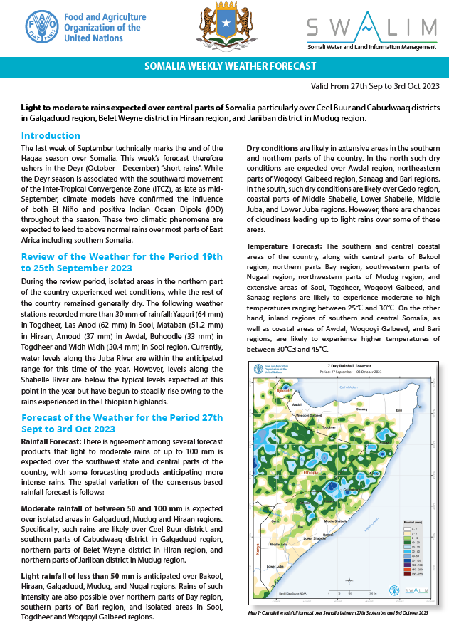 Light rainfall of less than 50 mm is expected over most parts of Belet Weyne district in Hiraan region; Galkacyo, Hobyo and Xaradheere districts in Mudug region; Ceel Buur district in Galgaduud region; Adan Yabaal district in Middel Shabelle region; Wanla Weyn district in Lower Shabelle region; northern parts of Xudur district, eastern parts of Ceel Barde district and northern parts of Tayeeglow district in Bakool region; Ceel Waaq district and northern parts of Baardheere district in Gedo region and some localized parts of Bay region. Rainfall of lighter intensity is likely to be observed in areas adjacent to the above districts and regions including the middle sections of the Juba River catchment within Somalia and upper catchments outside the country. Most parts of the Shabelle River catchment in the Somalia-Ethiopia border are likely to receive similarly light rains.