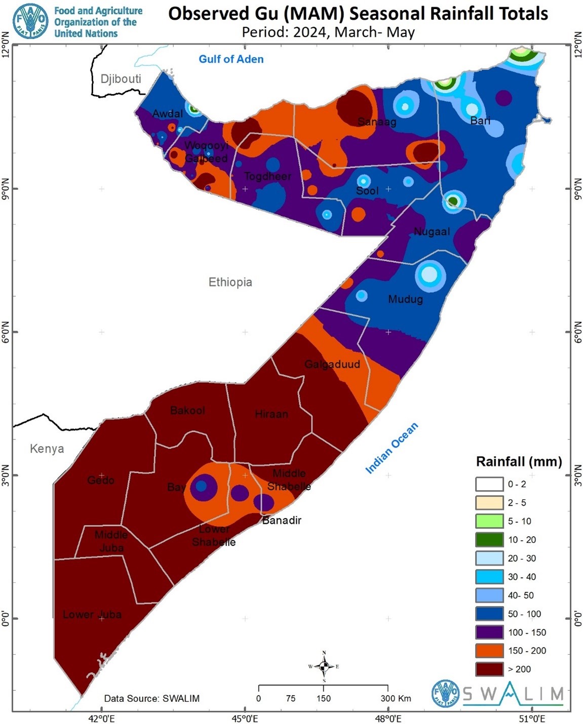 The Gu season is crucial for all regions in Somalia, contributing up to 40-70% of annual rainfall in the southern and northwestern parts of the country, and 50-70% in the central and northern parts of the country. On average, the Gu season brings 200-300 mm of rainfall in the southern parts, 100-200 mm of rainfall over the central and northwestern parts, and 50-100 mm of rainfall over the northern parts of the country.