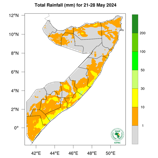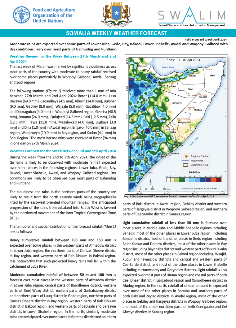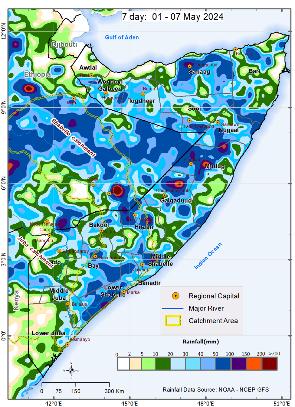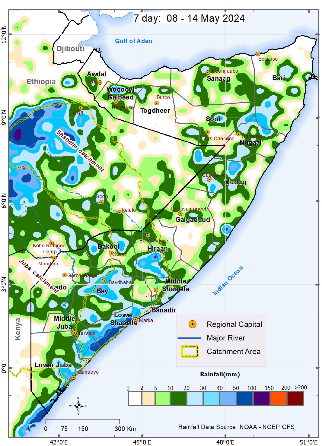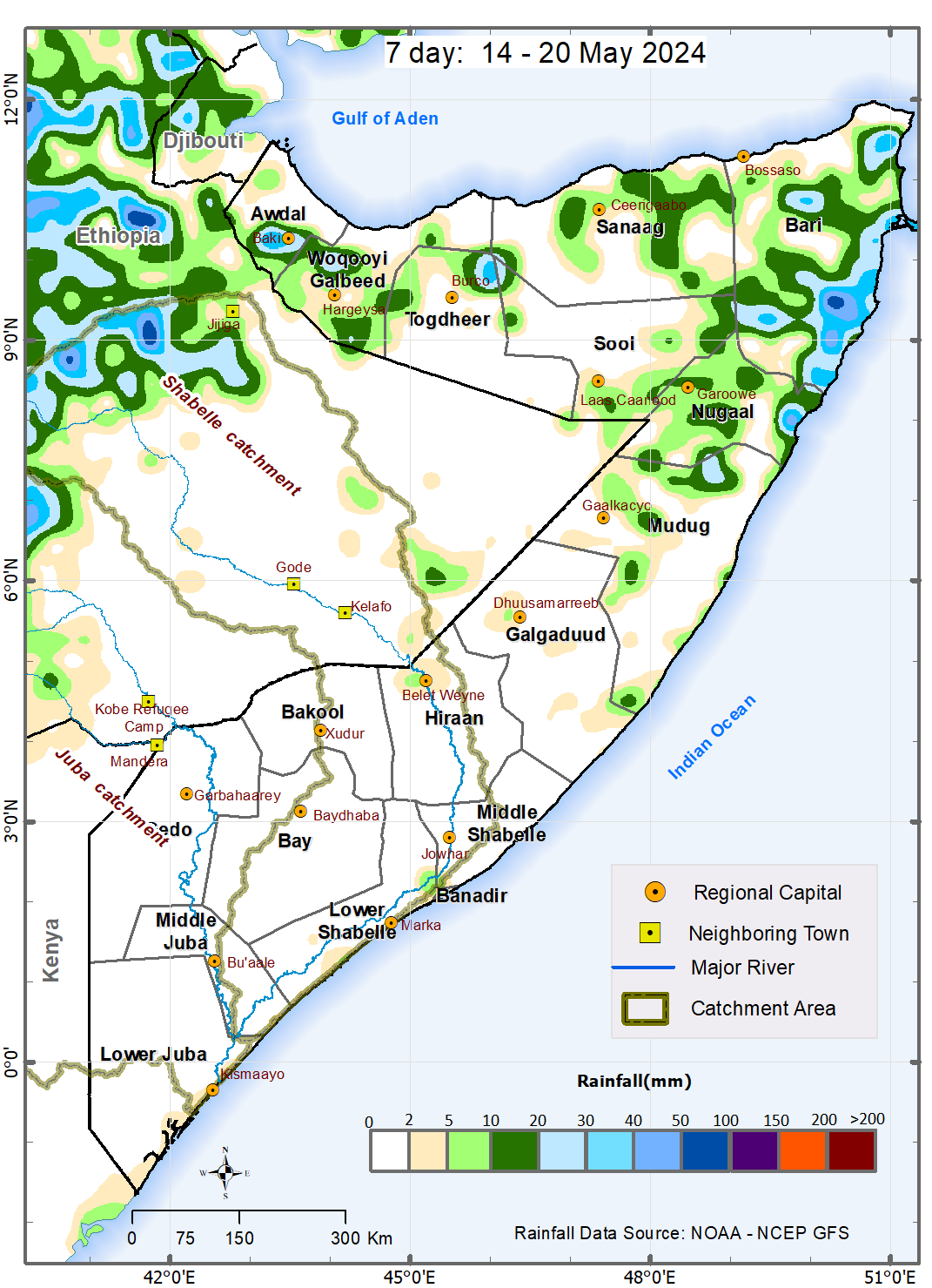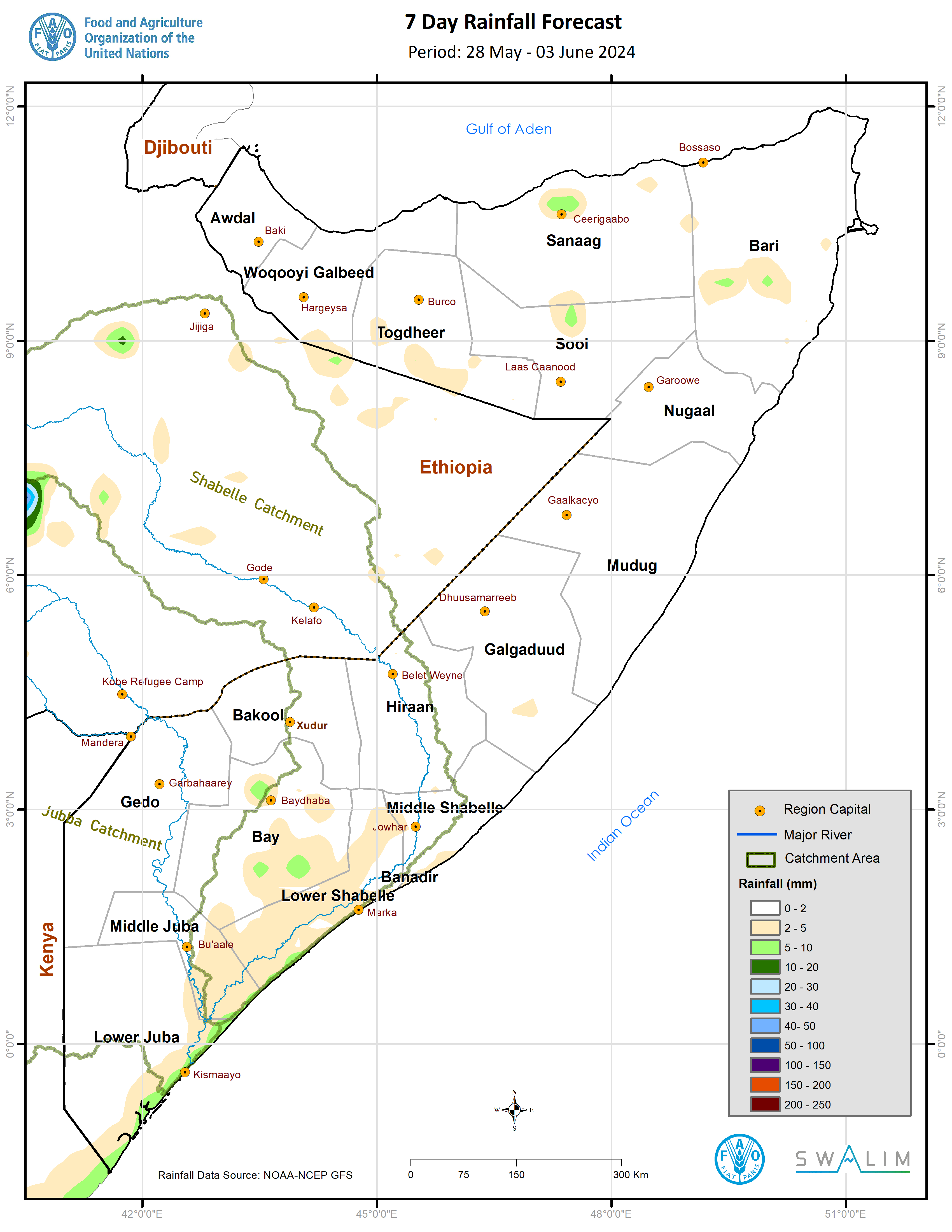 Moderate cumulative rainfall of 50 mm to 100 mm is likely to occur over most parts of Bay region particularly Buur Hakaba district; most parts of Bakool region including Rab Dhuure and Ceel Barde districts; and most parts of Lower Shabelle region particularly Marka and Baraawe districts, southern parts of Sablaale district, and western parts of both Wanla Weyn and Afgooye districts; Luuq, Belet Xaawo and Garbahaarey districts, northern parts of both Ceel Waaq and Baardheere districts; south-eastern parts of Afmadow district; western parts of both Belet Weyne districts in Hiraan region; Middle Shabelle region particularly Cadale district, central parts of Jowhar, and inland parts of Balcad district; areas at the border of Ceel Buur and Dhuusamarreeb districts in Galgaduud region. It is important to note that similar moderate rains will also be observed over several parts of both Shabelle and Juba River catchments within the country and in Ethiopia.