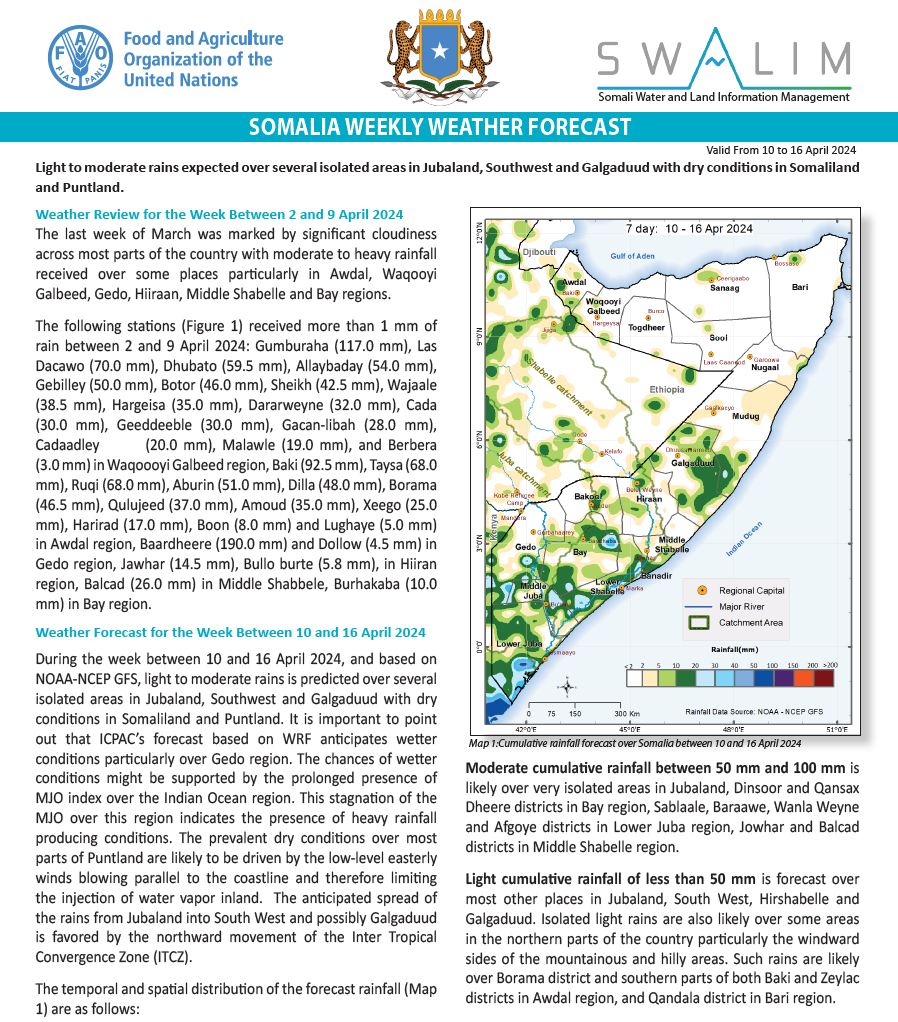 Based on the NOAA-NCEP Global Forecasting System (GFS) forecast, light to moderate rain is expected over several areas in the southern parts of the country with dry conditions expected to prevail over Somaliland and Puntland. The temporal and spatial distribution of the forecast rainfall (Map 1) are as follows: