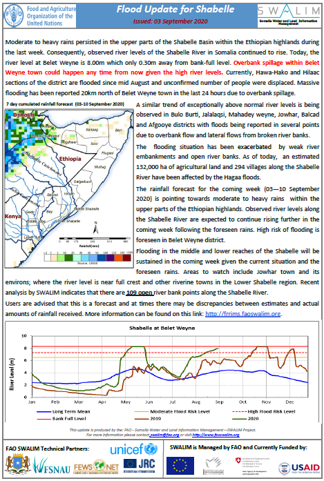 The runoff from the ongoing and forecast moderate rains over the Shabelle River catchment upstream in Ethiopia and near the Somalia border will sustain the current bankful water levels at Beletweyne. Additionally, voluminous water measuring up to 9 km can be identified on the current satellite images upstream of Beletweyne in Ethiopia. There is a high likelihood that the arrival of this flood wave will lead to further significant river level rise and flooding at Beletweyne in the coming days. The run off from the forecast very heavy rains over the Shabelle River catchment on the eastern parts of Bulo Burte in the coming week will add to the downstream flow of the flood wave currently at from Beletwyene leading to rise in river levels at Bulo Burte, Jalalaqsi and Jowhar to high flood risk levels then bankful levels. Flash floods are also expected in Bulo Burti and surrounding areas following the very heavy rainfall expected over the next 3 days.