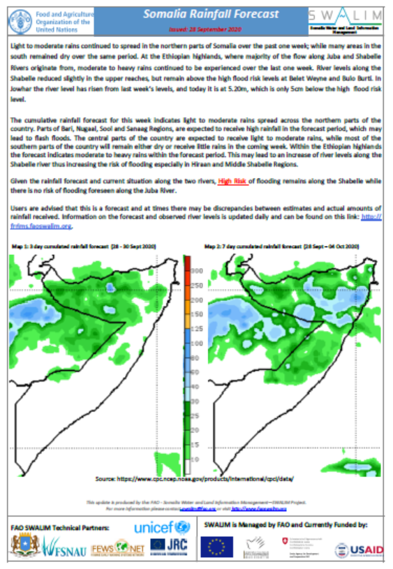 The light to moderate rainfall forecast over Shabelle River catchment in Ethiopian Highlands and within Hiran region in Somalia will generate runoff of less volume compared to previous week. However, the runoff from the previous moderate to heavy rains and ongoing light to moderate rains will sustain the river overflows and flooding at Belet Weyne and steady river level rise downstream at Bulo Burte, Jalalaqsi, Jowhar and Balcad.