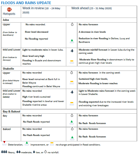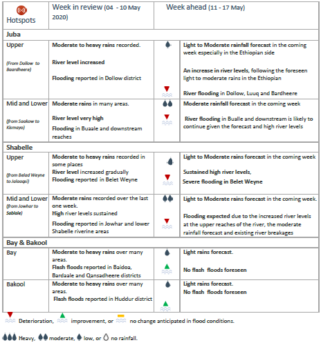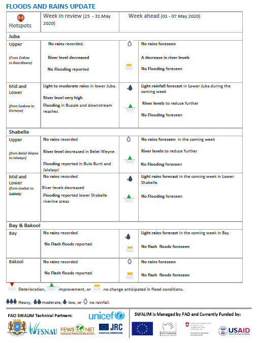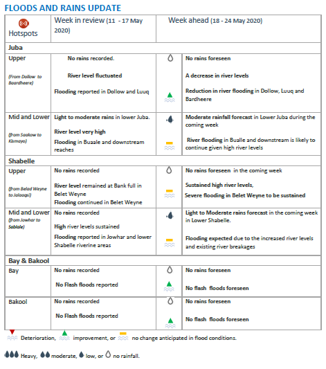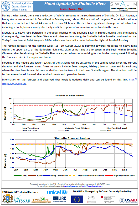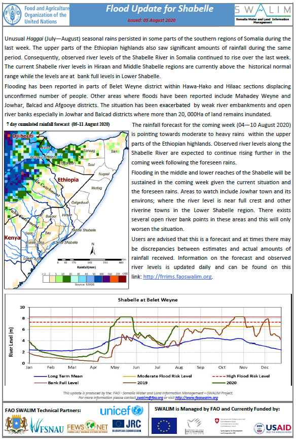 Moderate Risk of Flooding Along Juba River Particularly at Luuq and Bardheere Heavy rains received over Luuq (80.5 mm), and moderate rains (26.2 mm) observed over Dollow on 20th October 2023, coupled with moderate rains across the Ethiopian border have resulted to a sharp rise in river level at Luuq from 3.84 m on 18th to 5.6 m and at Dollow from 4.26 m on 19th to 4.78 m today. Added to previous light rains (14.1 mm) observed on 19th October at Luuq, moderate flood risk levels have been surpassed by 0.22 m and 0.1 m at Dollow and and Luuq, respectively. These localized rains also led to flashfloods affecting IDP camp at Luuq. Moderate rains received over Beletweyne (38.5 mm) on 20th October 2023, and possibly more intense rains over the surrounding areas, coupled with moderate rains across the Ethiopian border have led to a noticeable rise in river level at Beletweyne from 4.95 m on 19th to 5.15 m today (20th October 2023). The rainfall forecast for the next three days indicates moderate to heavy rain (50 – 150 mm) within the Somali-Ethiopia border particularly over upper parts of Gedo region, central parts of Bakool region and many parts of Hiraan region. Although only light rains (4 mm) have been observed at Bardheere today (20th October), the forecast moderate rains in the 24 hours and coming days over upper parts of Gedo region, is likely to lead to further rise in the river levels with moderate risk of flooding along the entire Juba River stretch with the flood wave expected at Bardhere within 2 days. This is therefore an alert to trigger both riverine and flash floods anticipatory actions and to caution communities living along the Juba riverine areas particularly Luuq and Bardheere districts to be vigilant and heed to anticipatory measures as the river levels keep rising. Although the risk of flooding along Shabelle River remains low today, the forecast moderate to heavy rains over Hiraan will lead to increase in river levels. If the heavy rains over Hiraan materialize, it may result in incidences of flash floods today and whose resultant run off and flood wave is expected to flow downstream towards Bulo Burte Burte and Jalalaqsi in the coming days. Additionally, the large volumes of water that was sighted at Limey district in Ethiopia which forms part of the upper catchment of Shabelle river, is likely to lead to a rise in water level at Beletweyne in two to three weeks.