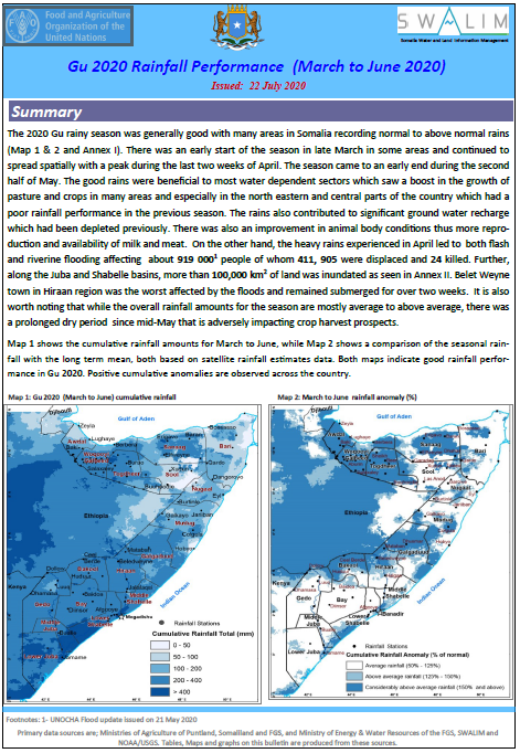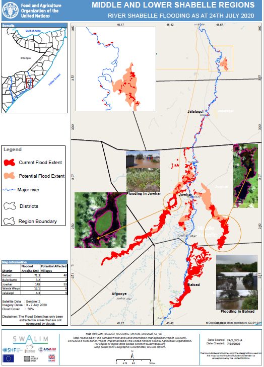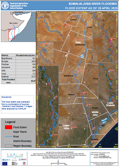 The Food and Agriculture Organization’s Somalia Water and Land Information Management (FAO SWALIM) Project, has finalized the analysis and mapping of the river breakages along the Juba and Shabelle rivers using very high resolution satellite imagery. Breakages identified in the map have been classified into four different categories; Open, Overflow, Canal Flooding Point and Closed with sandbags. A legend/Key for further explanation of the different types of breakages is provided. A total of 170 Open points, 46 Canal flooding points, 152 Overflow points and 29 points closed with sandbags have been identified along the Shabelle River while 26 Open points, 10 Canal flooding points, 16 Overflow points and 14 points closed with sandbags have been identified along the Juba River which require immediate attention. Several other points, which are either potential or temporarily closed with sandbags, have also been identified. The forecast ElNino season is likely to result to enhanced rainfall in Somalia and Ethiopian Highlands with high potential of flooding over the Juba and Shabelle rivers especially where open and potential points have been identified. There is therefore an immediate need to close the open points and reinforce areas where there are weak river embankments. Intervening agencies are advised to take advantage of the current dry period until the rains start and carry out temporary or long term measures to close the river breakages. This will see a reduction of riverine flooding in case of heavy rains and consequently a massive reduction in economic losses to the country.
