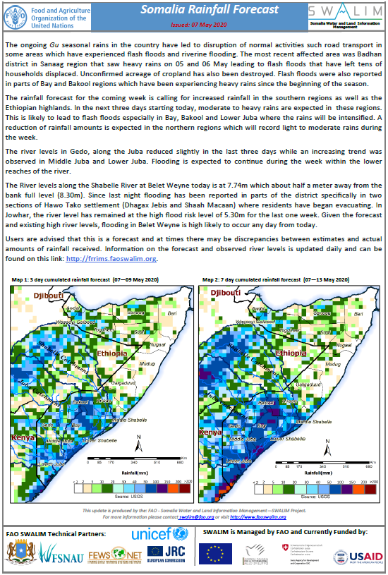 Moderate to heavy rains expected over inland parts of Central and North Eastern regions particularly around parts of Gedo, Bay, Bakool and Hiraan regions in South Somalia, parts of Mudug and Galgaduud regions in central Somalia and parts of Sool, Sanaag and Bari regions in Northern Somalia. Moderate rainfall of between 50 and 100 mm is forecast over eastern parts of Bakool region particularly Tayeeglow; northern parts of Bay region, and several areas in Hiraan region particularly Belet Weyne, Mahas, and Mataban (Map 1). Rainfall of similar amounts is also likely over Jariiban district in Mudug, Xasbahale district in Nugaal, and Laas Caanon, Xudun, and Taleex districts in Sool. The rains are likely to spread outwards and intensify over Bay, Hiraan, Mudug and Nugaal and prevail beyond the forecast period to cumulative amounts above 100 mm. Other places forecast to receive comparable amounts of rainfall include Garadag, Dhahar, and Buran in Sanaag region, Qardho and Dangoroyo in Bari region, Buuhodle, Balidhiig, and Warabeye in Togdheer region. Light rainfall of less than 50 mm is anticipated across several areas in Somalia. These include Burao, Beer, and Xaaji Saalax in Togheer region; Caynabo, Waridaad, and Yagori in Sool region; Erigavo and El Afweyne in Sanaag region; Ufayn, Ballidhig, and Bandar Beyla districts in Bari region; Garowe and Burtinle districts in Nugaal region; extensive parts of Mudug region; inland areas of Galgaduud region, particularly around Dhuusamarreb, Cadaado, and Cabudwaaq districts; Adan Yabaal and Jowhar in Middle Shabelle region; Wanla Weyne district in Lower Shabelle region; areas around Baidoa and Qansahdere in Bay region; areas around Luuq and Bardheere in Gedo region, as well as areas around Jamame, Kismaayo, and Badhaadhe districts in Lower Juba region. Dry conditions are likely over extensive areas in Awdal region, Woqooyi Galbeed region, western and northern parts of Togdheer region, as well as coastal and western parts of Sanaag region. Similar dry conditions are likely over extensive coastal and northwestern areas of Bari region, Galkayo district and the southern coastal parts of Mudug region, coastal parts of Galgaduud region, and coastal parts of both Lower and Middle Shabelle regions. Dry conditions are also anticipated over Banadir region, southern parts of Bay region, northern and western parts of Gedo region, as well as extensive areas of Lower and Middle Juba.