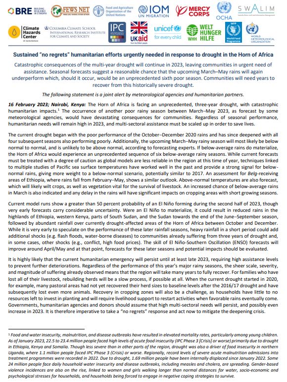 16 February 2023; Nairobi, Kenya: The Horn of Africa is facing an unprecedented, three-year drought, with catastrophic humanitarian impacts.1 The occurrence of another poor rainy season between March–May 2023, as forecast by some meteorological agencies, would have devastating consequences for communities. Regardless of seasonal performance, humanitarian needs will remain high in 2023, and multi-sectoral assistance must be scaled up in order to save lives.