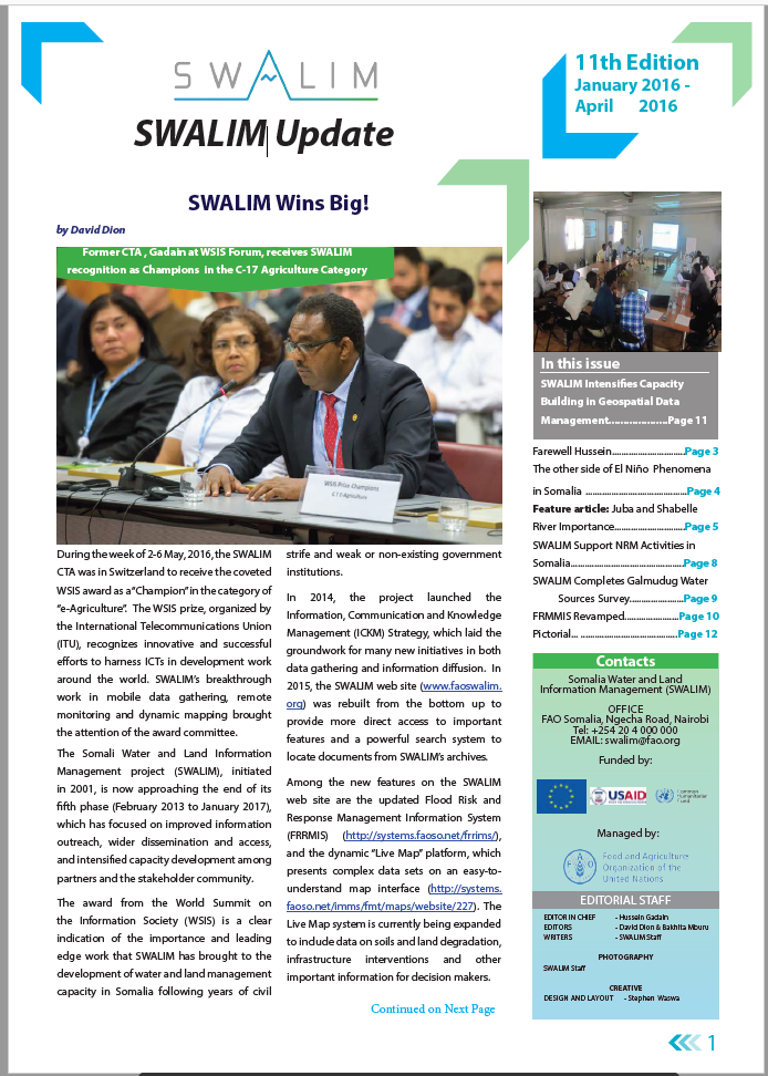 We are pleased to share Issue 11 of our newsletter “SWALIM Update” for the period January 2016 – April 2016.Publication Download