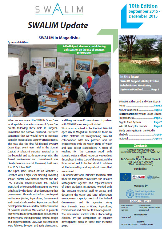 "SWALIM Update" is a newsletter produced by SWALIM. The newsletter was previously issued quarterly but effective 2015, is now a triannual newsletter. "SWALIM Update" is used to keep our wide base of clients, drawn from local and international non-governmental organisations, government agencies, United Nations agencies, academic institutions, civil society and communities, abreast of the activities and accomplishments of the SWALIM project in the preceding period. The newsletter summarises ongoing and completed activities in water, land, remote sensing, information management and capacity building whose results are expected to further enhance available data and information on the state of, challenges faced and opportunities available for sustainable water and land resource management in Somalia.