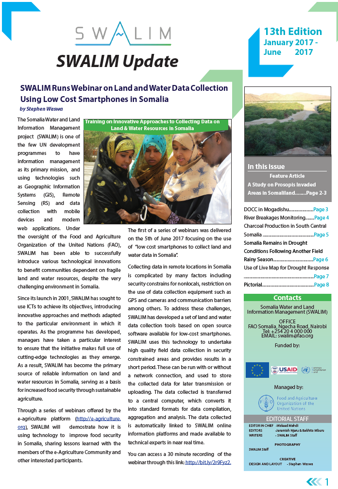 Welcome to yet another edition of the SWALIM Update, in this edition we cover; SWALIM Runs Webinar on Land and Water Data Collection Using Low Cost Smartphones in Somalia, SWALIM Maps Prosopis invaded areas in Somaliland, Impacts of river breakages monitoring on communities along Shabelle River, SWPublication Download