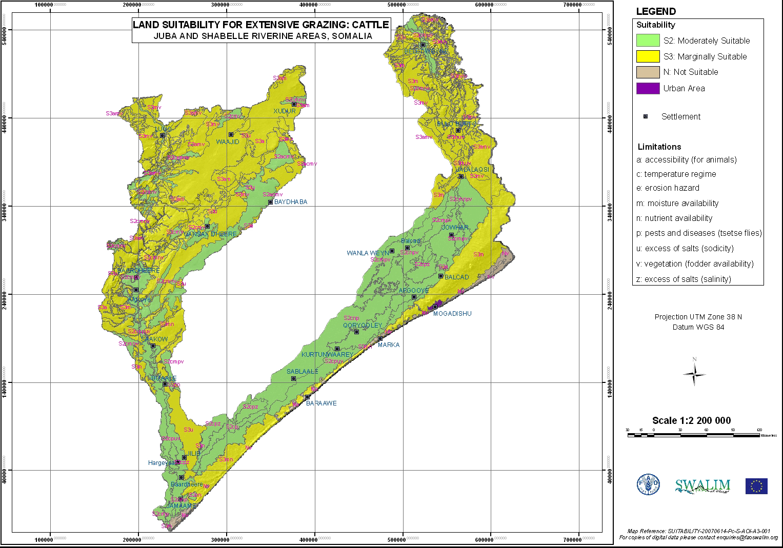Land Suitability Assessment of the Juba and Shabelle Riverine Areas in Southern Somalia: L-09 are available in the digital documents repository or through the publications section. The reports also give details of the Somalia Automated Land Evaluation System (SOMALES), which is the application for Somalia of the FAO Framework for Land Evaluation and ALES software.