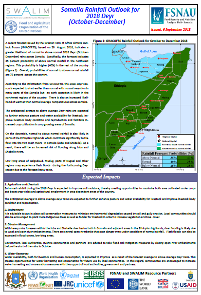 Saadaasha dhawaan uu soosaartay Shirweynaha Saadaasha Cimilada ee Weyn Geeska Afrikada (GHACOF50), oo soo baxday 28 Agoost 2018, waxay tilmaameysa inay dhici karto in roobabka Deyta (Oktoobar- Diseembar) ay noqdaan caadi iyo kuwo sarreeya caadiga guud ahaan Soomaaliya.Publication Download