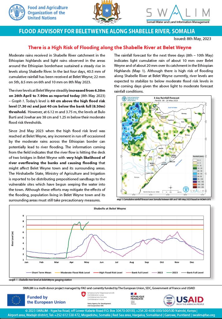 Based on NOAA-NCEP GFS, dry conditions are expected to prevail in most parts of the country with chances of very light rains in some parts of Jubaland (Figure 1). Dry conditions are also expected over the entire Shabelle River catchment. Light isolated rains are expected over the Juba River catchment within and outside Somalia.