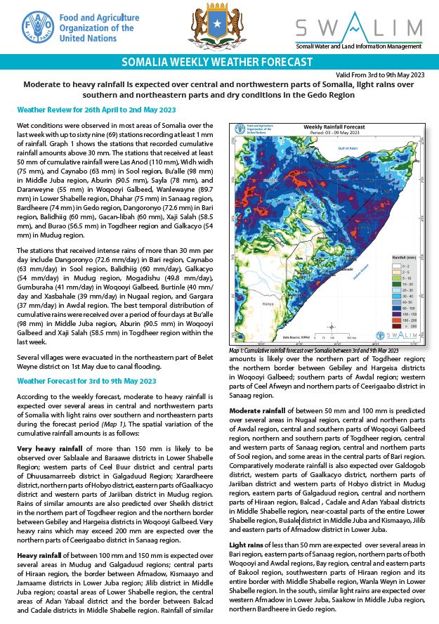 Based on the ICPAC seasonal forecast, the Deyr rains are likely to begin in the first dekad of October in Togdheer, Sool and Nugaal regions. According to NOAA-NCEP GFS, widespread light rainfall is expected over most parts of Woqooyi Galbeed, Togdheer, Sool, Sanaag and Hiraan regions and some inland parts of Nugaal, Mudug, and Galgaduud regions. The spatial spread of the forecast rainfall conditions are as follows: Moderate rainfall of between 50.0 and 100.0 mm is forecast over northern parts of Hargeisa districts in Woqooyi Galbeed region; northern parts of Ceerigaabo district in Sanaag region; southwestern parts of Qardo district in Bari region; eastern parts of Bulo Burte district in Hiraan region; western and eastern parts of Buuhodle district in Togdheer region; and western parts of Laas Caanood district in Sool region. The intensity of the rains over northern parts of both Hargeisa and Ceerigaabo districts may lead up to more than 100 mm at the end of the forecast week. Heavy rainfall above 150 mm is likely over the upper catchments of Shabelle River in Ethiopia in the far north-eastern highlands of Gode city. Light rainfall of less than 50.0 mm is expected over most other parts of Woqooyi Galbeed, Togdheer, Sool, and Sanaag regions; and most other parts of Qardo, Bulo Burte, Buuhodle, and Laas Caanood districts. Similarly light rains are also expected over most parts of Borama and Baki districts in Awdal region; Qandala and Bandarbeyla districts in Bari region; Garowe and Burtinle districts in Nugaal region; Galkacyo district and inland parts of bothJ ariiban and Hobyo districts in Mudug region; Cadaado, Dhuusamarreeb and Cabudwaaq districts in Galgaduud region; Belet Weyne district in Hiraan region; Ceel Barde and Tayeglow districts in Bakool region and Baydhaba district in Bay region. Similar light rains are expected over the Shabelle River catchment within Somalia. Dry conditions are likely over most parts of the following regions: Lower Juba, Middel Juba, Gedo, Lower Shabelle, and Middel Shabelle. Similar conditions are expected over Dinsoor district in Bay region; Rab Dhuure and Waajid districts in Bakool region; Ceel Dheer and Xaradheere districts in Galgaduud region; coastal parts of both Hobyo and Jariiban districts in Mudug region; coastal parts of Eyl district in Nugaal region; Iskushuban, Caluula and Bossaso districts in Bari region; and Zeylac and Lughaye districts in Awdal region. Similar dry conditions are likely over most areas over the Juba River catchment within and outside Somalia.