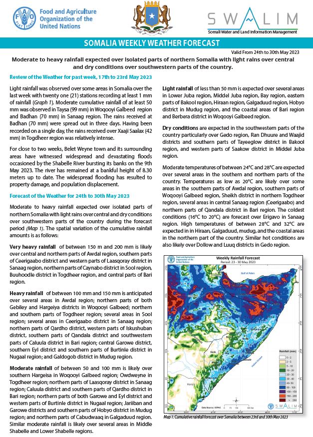 According to NOAA-NCEP GFS, light rains are likely over some areas in the south with dry conditions expected to prevail in most other parts of the country, particularly Somaliland and Puntland (Figure 2). The rains in the south may be of moderate intensity over isolated areas in Bay, Lower Shabelle, Banadir, and Middle Shabelle regions, and over the coastal parts of both Galgaduud and Mudug. These light to moderate rain is likely to be observed between 22 and 24 November 2025.