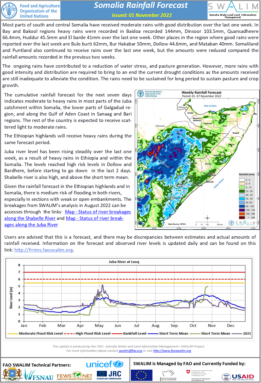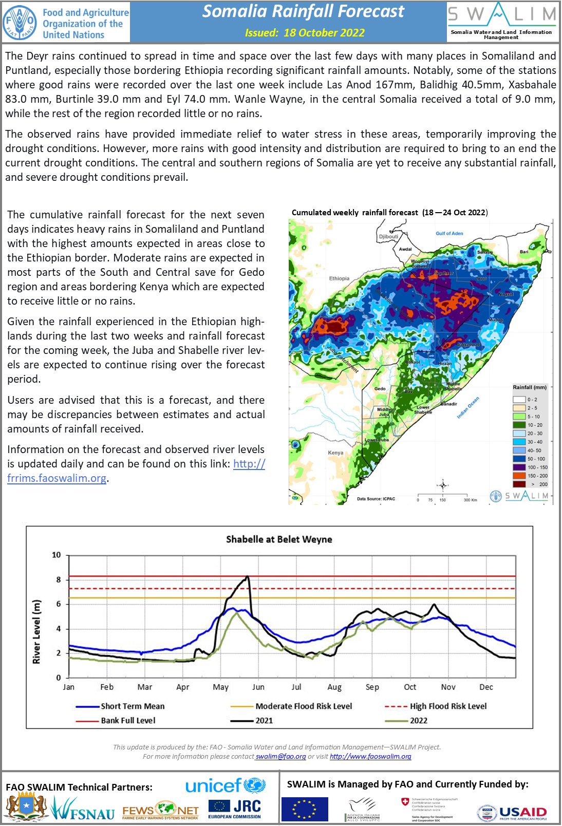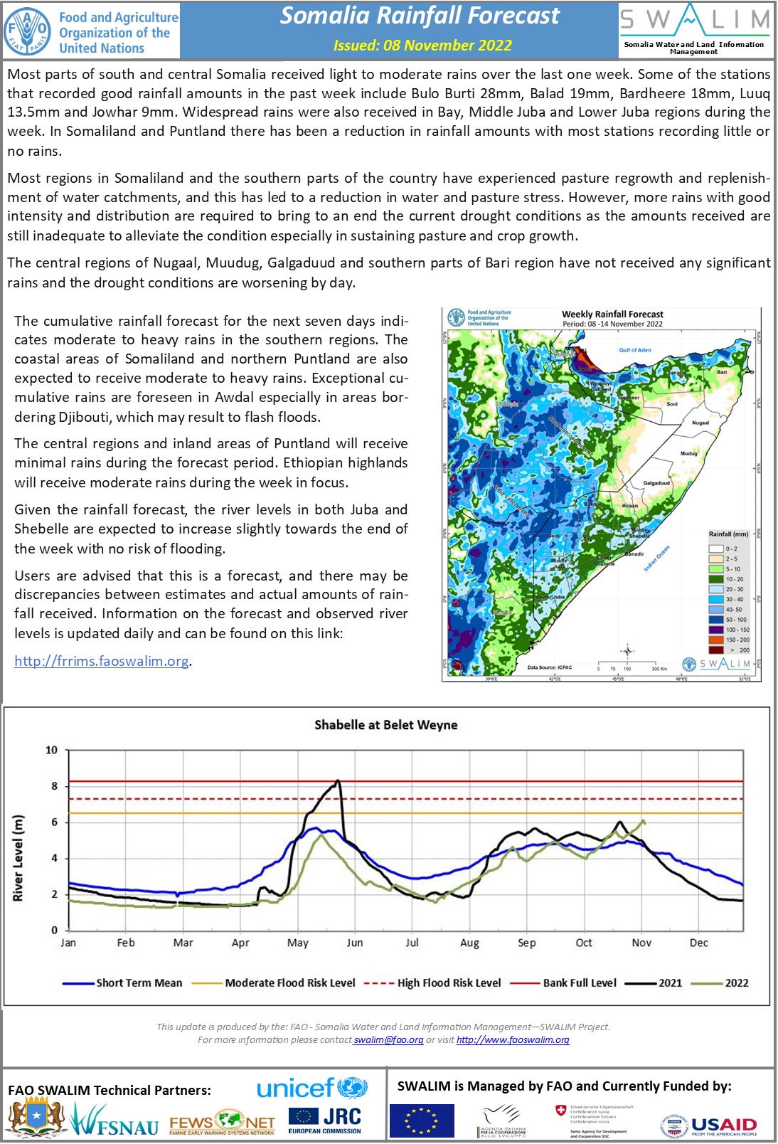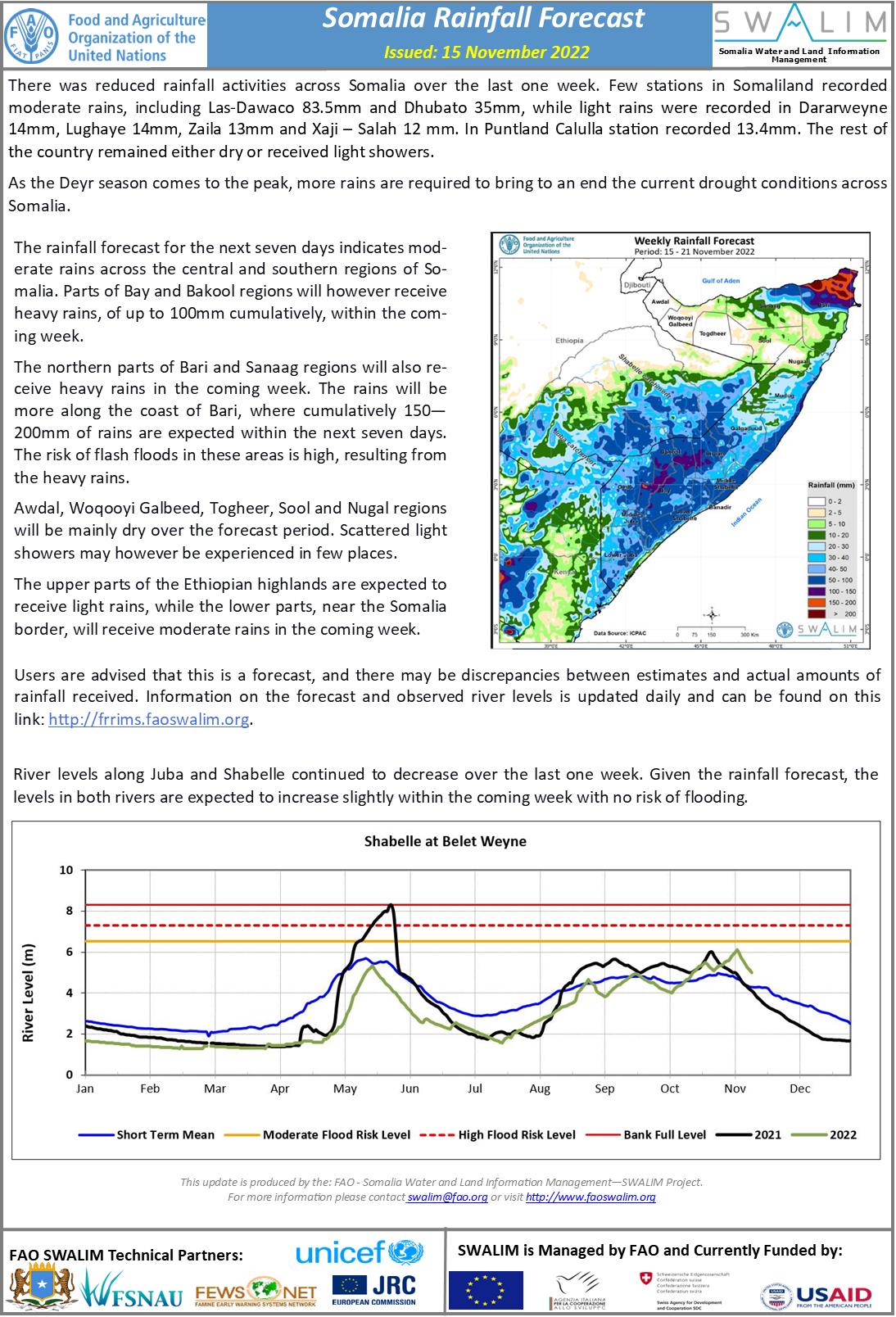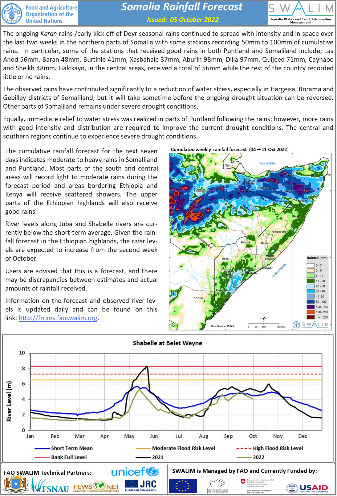 Moderate cumulative rainfall of 50 mm to 100 mm is likely to occur over most parts of Bay region particularly Buur Hakaba district; most parts of Bakool region including Rab Dhuure and Ceel Barde districts; and most parts of Lower Shabelle region particularly Marka and Baraawe districts, southern parts of Sablaale district, and western parts of both Wanla Weyn and Afgooye districts; Luuq, Belet Xaawo and Garbahaarey districts, northern parts of both Ceel Waaq and Baardheere districts; south-eastern parts of Afmadow district; western parts of both Belet Weyne districts in Hiraan region; Middle Shabelle region particularly Cadale district, central parts of Jowhar, and inland parts of Balcad district; areas at the border of Ceel Buur and Dhuusamarreeb districts in Galgaduud region. It is important to note that similar moderate rains will also be observed over several parts of both Shabelle and Juba River catchments within the country and in Ethiopia.