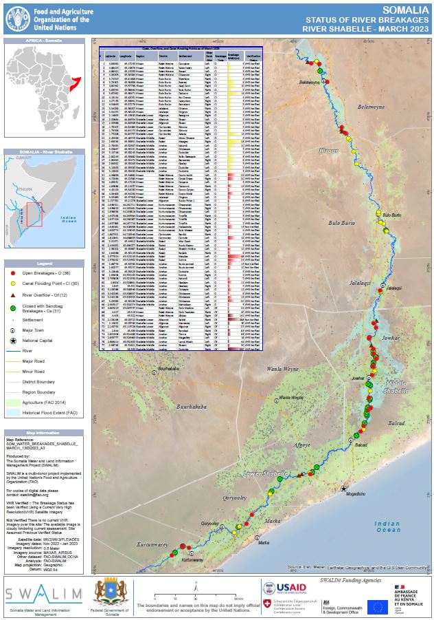 FAO-SWALIM has updated the status of the river breakages along the Juba and Shabelle Rivers using available Very High Resolution (VHR) satellite imagery and a Digital Elevation Model (DEM). Five types of breakages have been identified; Open, Overflow, Canal Breakage, Canal Intake Flooding and Closed with sandbags. The open breakages are those that are currently open as observed on the latest VHR image available. All the observations reported refers to the latest suitable VHR satellite image available, which is indicated in the online database. A legend/Key for further explanation of the different types of breakages is provided.