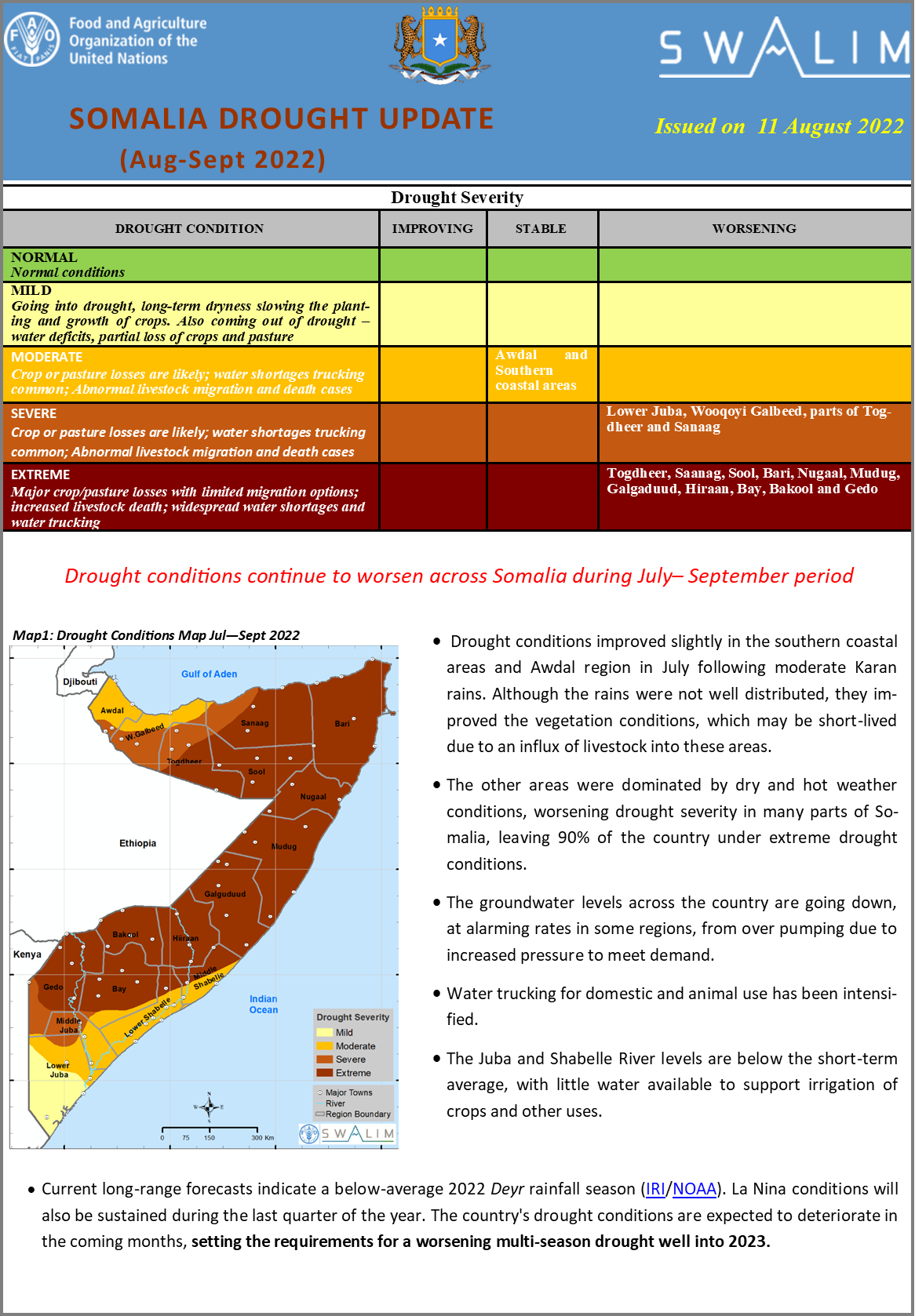Dry conditions are likely to prevail over most parts Awdal, Woqooyi Galbeed, Togdheer, Sanaag, Sool, Bari, Nugaal, Mudug and Galgaduud regions; most parts of Hiraan region particularly Bulo Burte and Jalaqsi districts and eastern parts of Belet Weyne; eastern parts of Middle Shabelle region particularly Adan Yabaal district and the northern parts of Cadale district; and some parts of Bakool region particularly Waajid, Rab Dhuure and Tayeeglow districts.