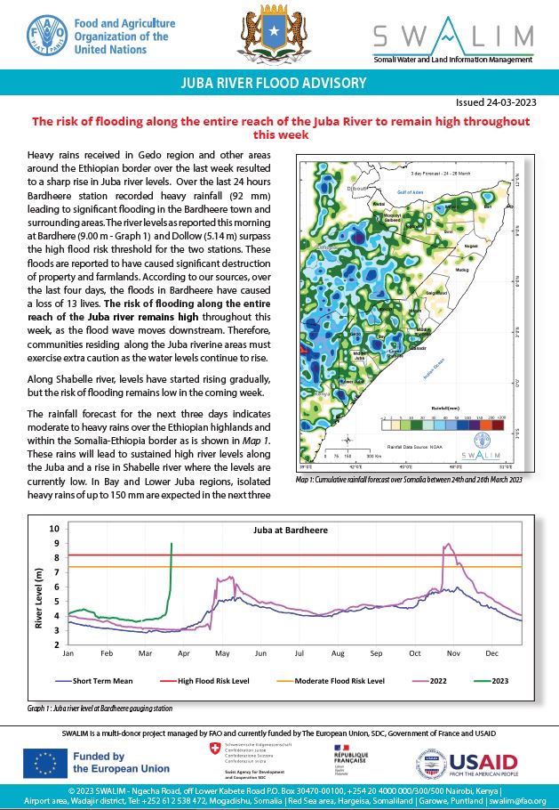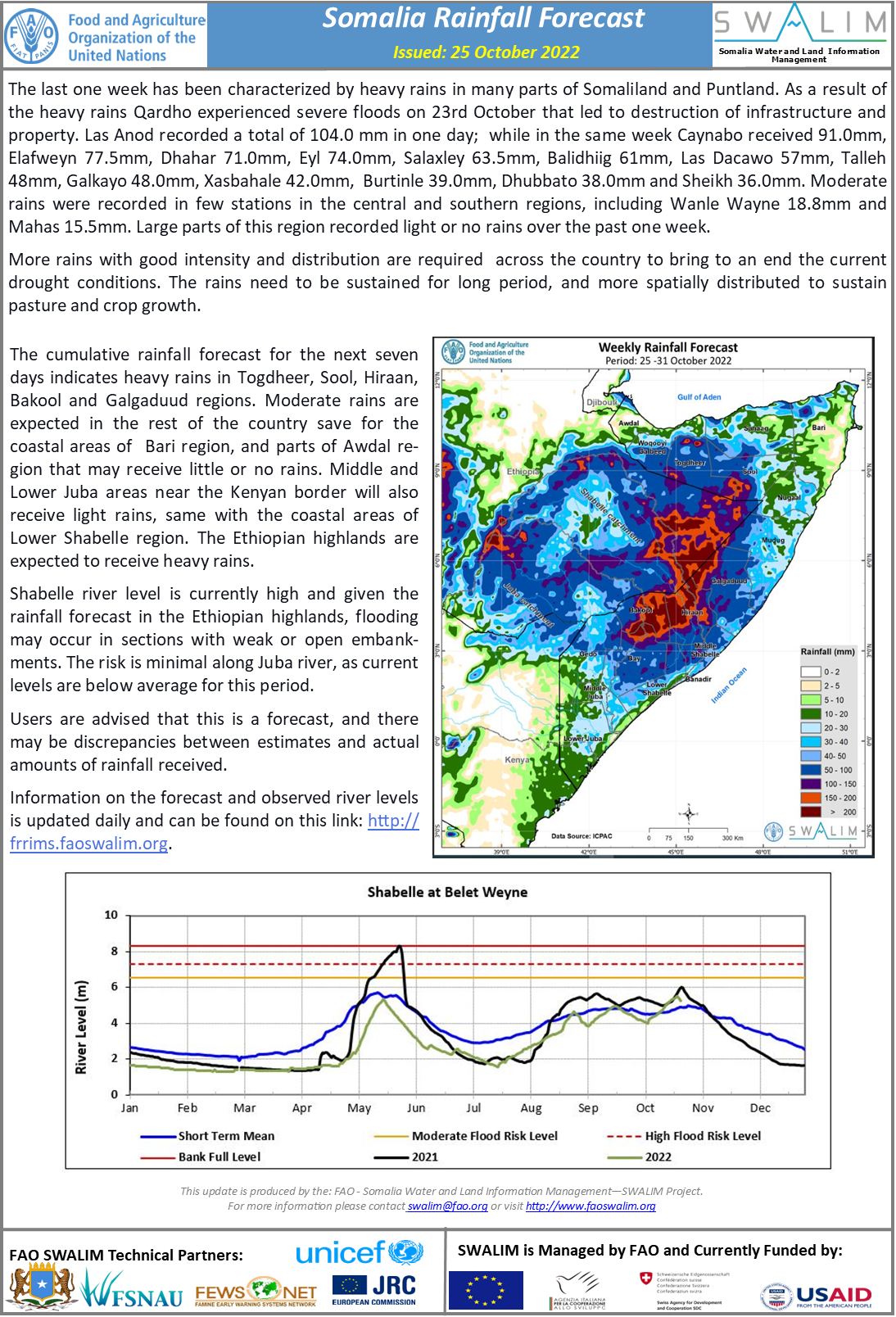 Moderate cumulative rainfall of 50 mm and more is likely over isolated areas in the northern parts of Afmadow district in Lower Juba region; northern parts of Baydhaba district in Bay region; central parts of Wanla Weyne district in Lower Shabelle region; Balcad district in Middle Shabelle region; northern parts of Ceel Barde district and northern parts of Tayeeglow district in Bakool region; Jalalaqsi district and central parts of Bulo Burte district in Hiraan region; northern and southern parts of Laasqoray district and eastern parts of Ceerigaabo district in Sanaag region; and central parts of Burco district in Togdheer region. Similar moderate rains will also be observed over most parts of the upper catchments of Shabelle River in Ethiopia. The rains over isolated areas in the northern parts of Afmadow district in Lower Juba region; northern parts of Baydhaba district in Bay region; central parts of Wanla Weyne district in Lower Shabelle region may increase in intensity with up to more than 50 mm within the first 3 days and summing up to more than 100 mm by the end of the forecast period.