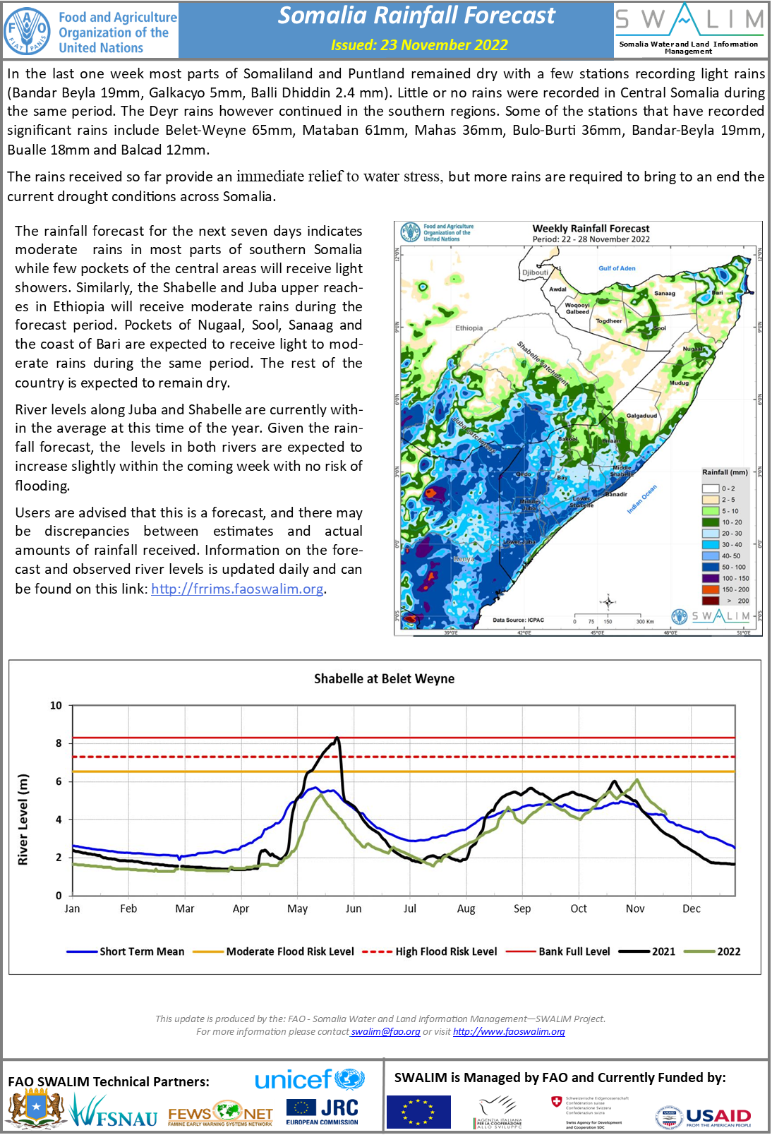 Based on the NOAA-NCEP Global Forecasting System (GFS) forecast, light to moderate rain is expected over several areas in the southern parts of the country with dry conditions expected to prevail over Somaliland and Puntland. The temporal and spatial distribution of the forecast rainfall (Map 1) are as follows: