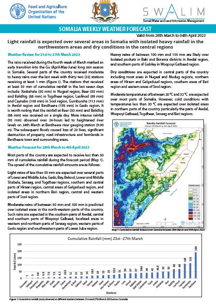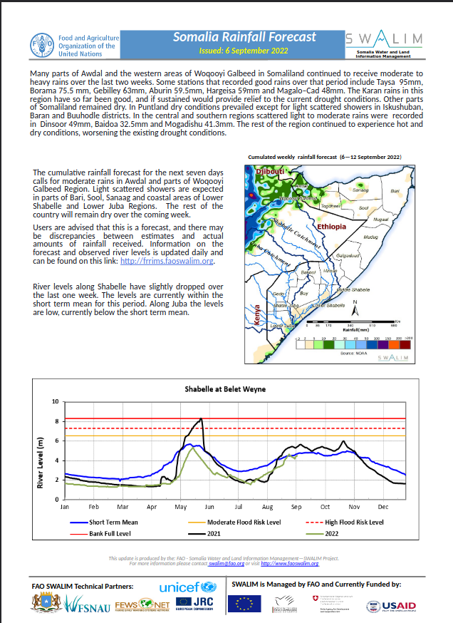 Light cumulative rainfall of less than 50 mm is forecast over several areas in the country including Togdheer, Sool, Sanaag, Galgaduud, Hiraan, Lower Shabelle, Bakool and Gedo regions; Borama district in Awdal region; Gebiley district, northern and southern parts of Hargeisa district in Woqooyi Galbeed region; Bossaso and Qandala districts and northern parts of Qardho district in Bari region; Burtinle district and southern parts of Garowe district in Nugaal region; Xaradheere and Galdogob districts, northern parts of Galkacyo district, western parts of Hobyo district in Mudug region; Jowhar and Adan Yabaal districts in Middle Shabelle region; and Qansax Dheere and northern parts of Buur Hakaba district in Bay region. It is important to note that such light rains are also likely over the upper catchments of Juba River in Ethiopia.