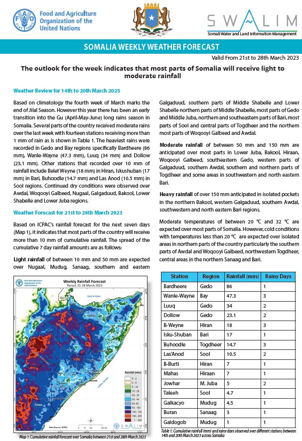 Light cumulative rainfall of less than 50 mm is forecast over several areas in the country including most parts of Togdheer, Sool, Galgaduud, Middle Juba and Banadir regions; southern parts of Hargeysa district in Woqooyi Galbeed region; Ceerigaabo district in Sanaag region; some isolated parts in the western parts of Qardho district in Bari region; northern parts of Garoowe district and western parts of Burtinle District in Nugaal region; Gaalkacyo, Galdogob and Xarardheere districts and southern parts of Hobyo district in Mudug region; Jalalaqsi district and northern parts of both Belet Weyne and Bulo Burte districts in Hiraan region; northern parts of both Jowhar and Adan Yabaal districts and coastal parts of both Balcad and Adan Yabaal districts in Middle Shabelle region; eastern parts of both Wanla Weyn and Afgooye districts in Lower Shabelle region; western parts of Qansax Dheere district and southern parts of Dinsoor district in Bay region; Doolow district and southern parts of Baardheere district in Gedo region; Jamaame district, northern parts of Kismaayo district and southern parts of Afmadow district in Lower Juba region.