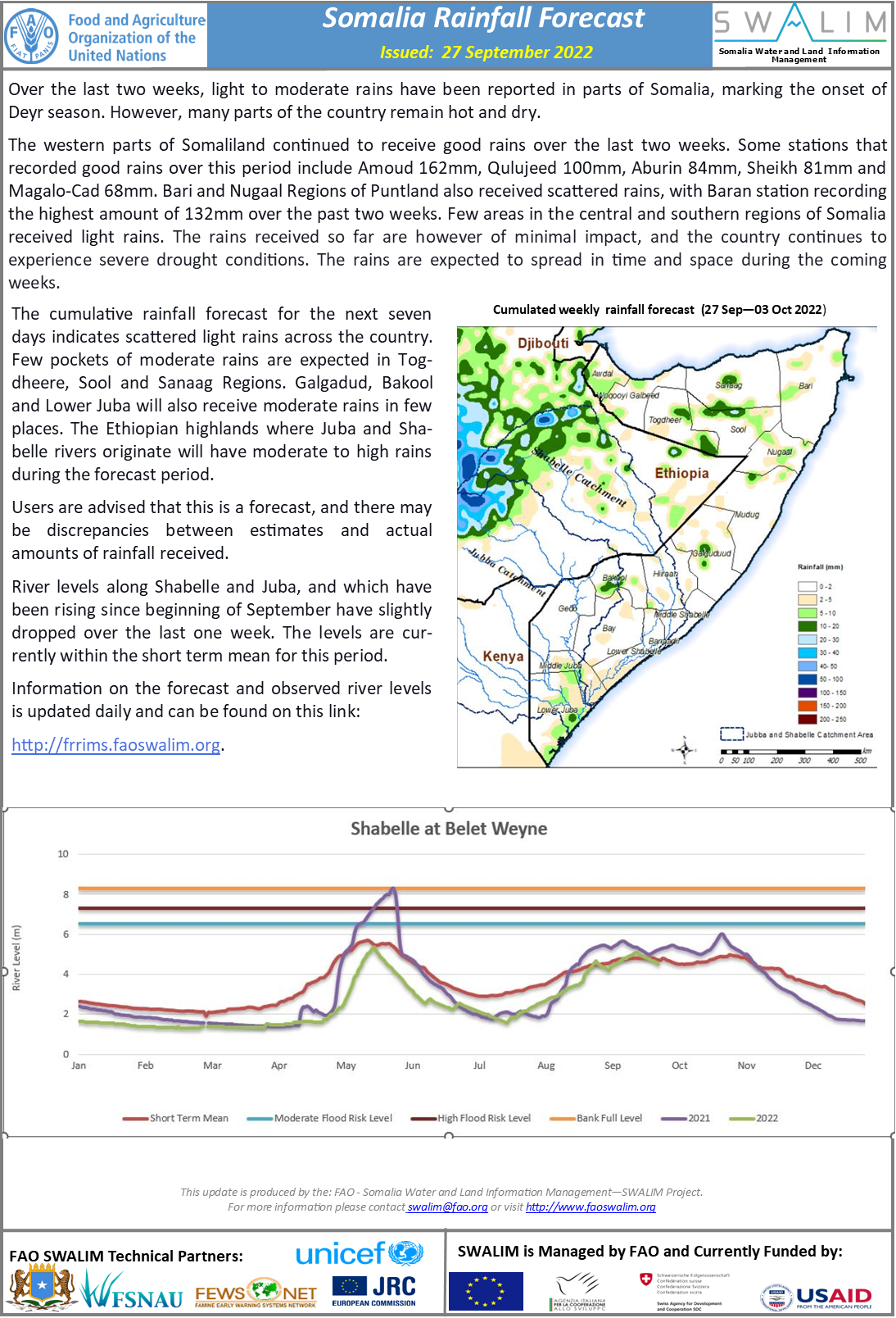Light cumulative rainfall of less than 50 mm is forecast over most parts of Gedo region, and some parts of Lower Juba particularly Badhaadhe district, Bay particularly Baydhaba district, Bakool particularly Ceel Barde district, Hiraan particularly Belet Weyne town, Saakow district in Middle Juba region, Middle Shabelle including Banadir region. Light rainfall is also likely over the western parts of both Dhuusamareeb and Ceel Dheer districts in Galgaduud region, southmost parts of both Gebiley and Hargeisa districts in Woqooyi Galbeed region and elevated areas in eastern parts of Ceel Afweyn district in Sanaag region. It is important to point out that light to moderate rains is forecast to fall within the catchments of Juba River. Light rains are anticipated over the lower reaches of Shabelle River and moderate rains further up in Ethiopian Highlands.