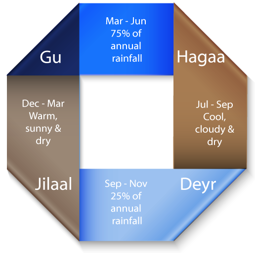 - Gu’: Xilli roobaadka ugu muhiimsan oo ka bilowda bartamaha Maarso oo sii socda ilaa Juunyo.
