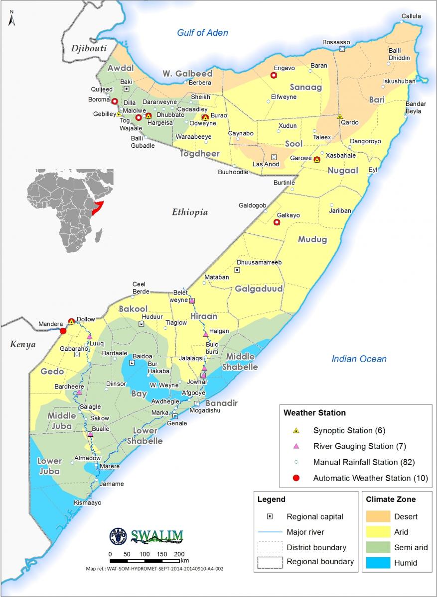 Currently, there are over 100 manual rainfall stations, eight synoptic weather stations and 11 automatic weather stations in the country. Data from the manual stations is transmitted to SWALIM’s Nairobi office on a regular basis through satellite, gprs, e-mail or telephone. Seven automatic weather stations are strategically located in the northern parts of the country, including Hargeysa, Borama, Sheikh, Aburin, Burao, Dollow, Garowe and Galckayo. The other automatic weather stations are located in the south in Baidoa and Mogadishu. It is hoped that, when the situation allows, more automatic weather stations will be installed in the southern regions. The stations record a variety of weather elements, including rainfall, temperature, relative humidity, atmospheric pressure, wind speed, wind direction and solar radiation. Data from these automatic stations is received by SWALIM in near-real-time through satellite feeds every four hours. This weather monitoring has been made possible through the partnership between SWALIM and the Somali line ministries, as well as other agencies present on the ground. The data is then processed and disseminated to the public as information through SWALIMs information dissemination channels.